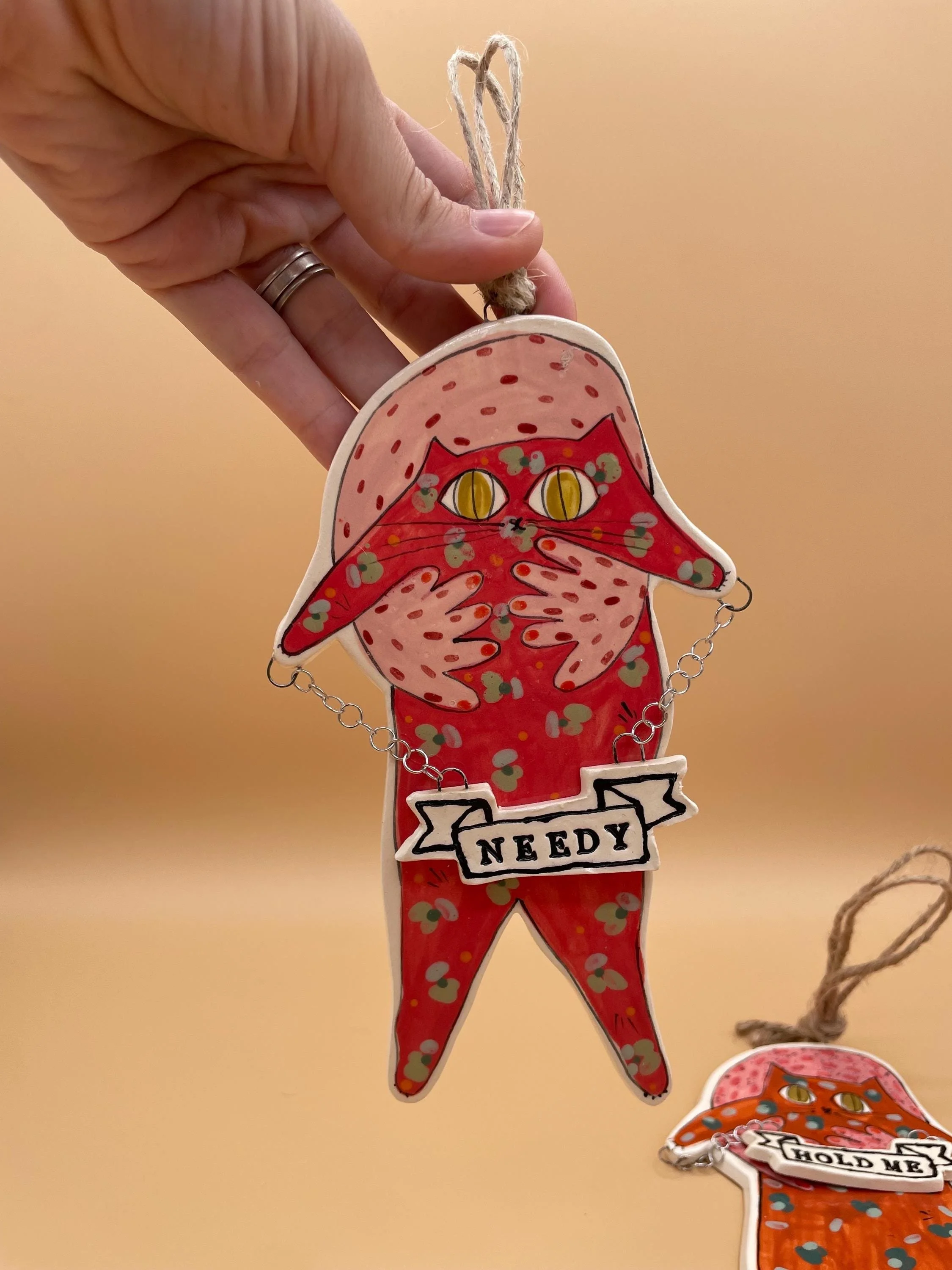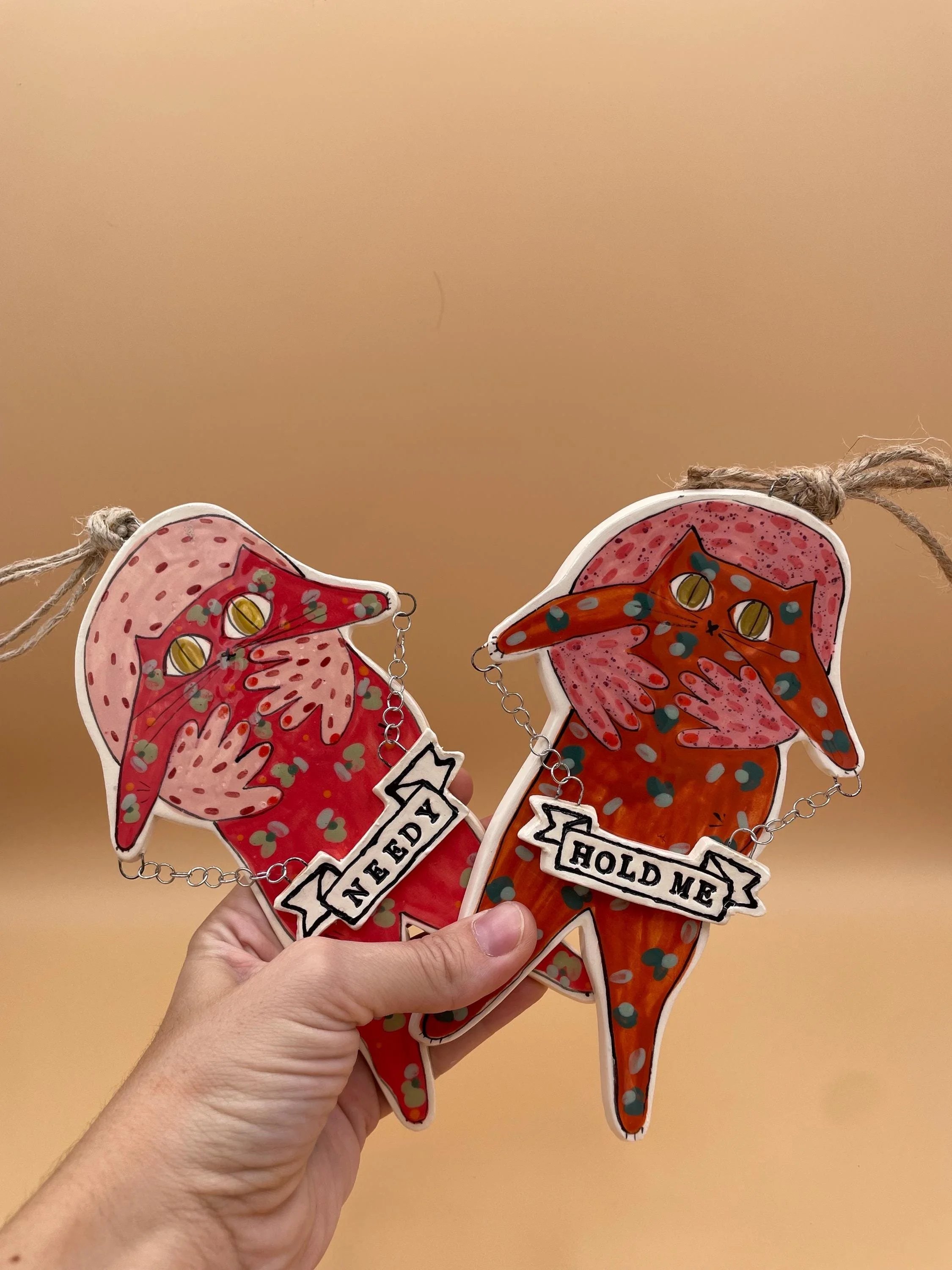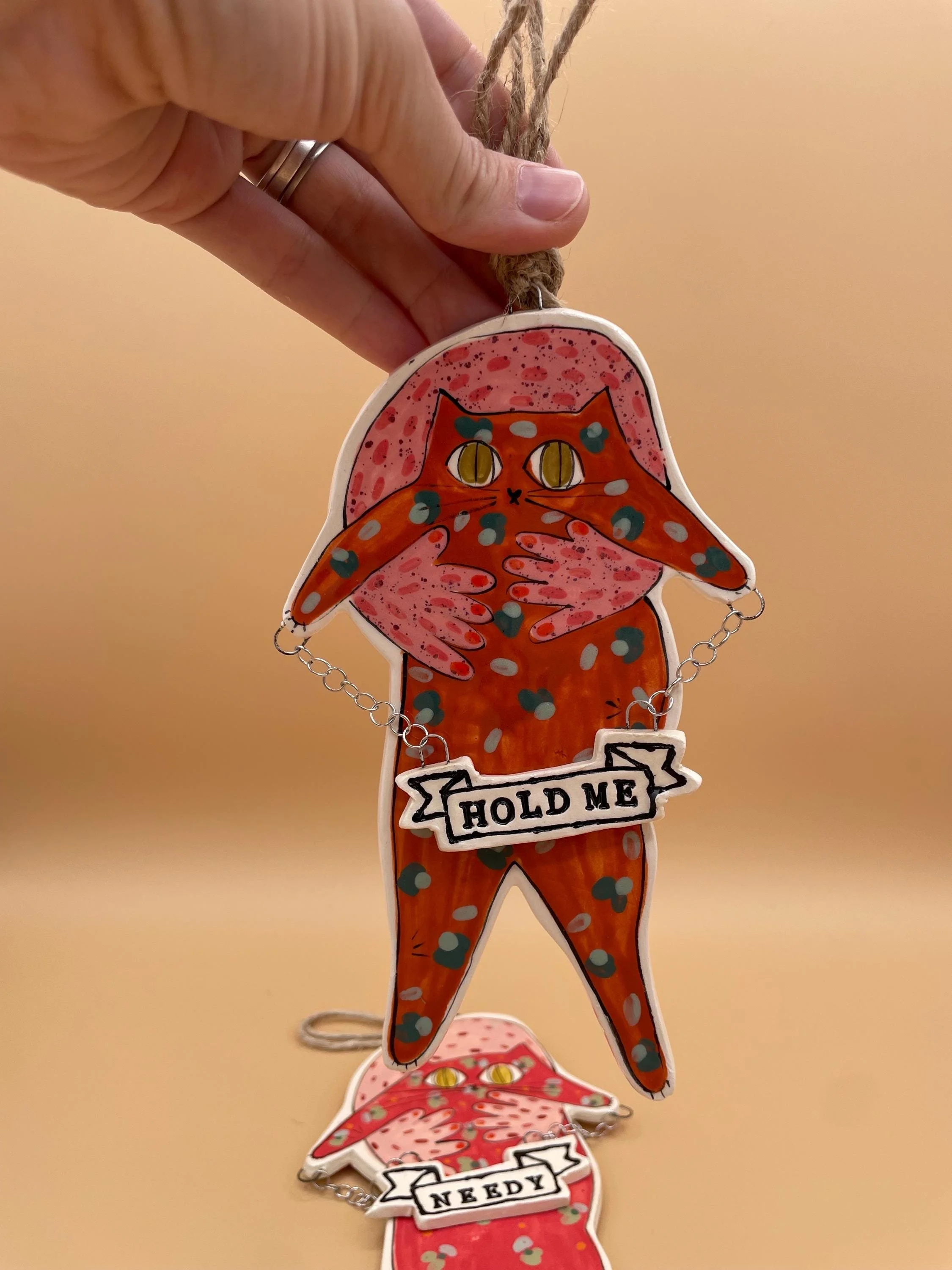 Your choice of 'NEEDY' or 'HOLD ME'. Each hangs from natural twine.