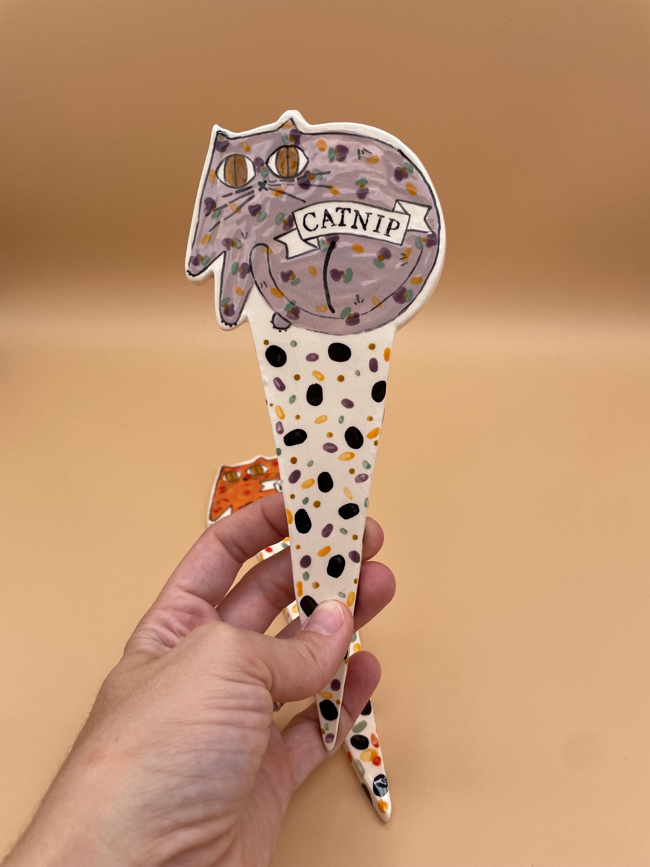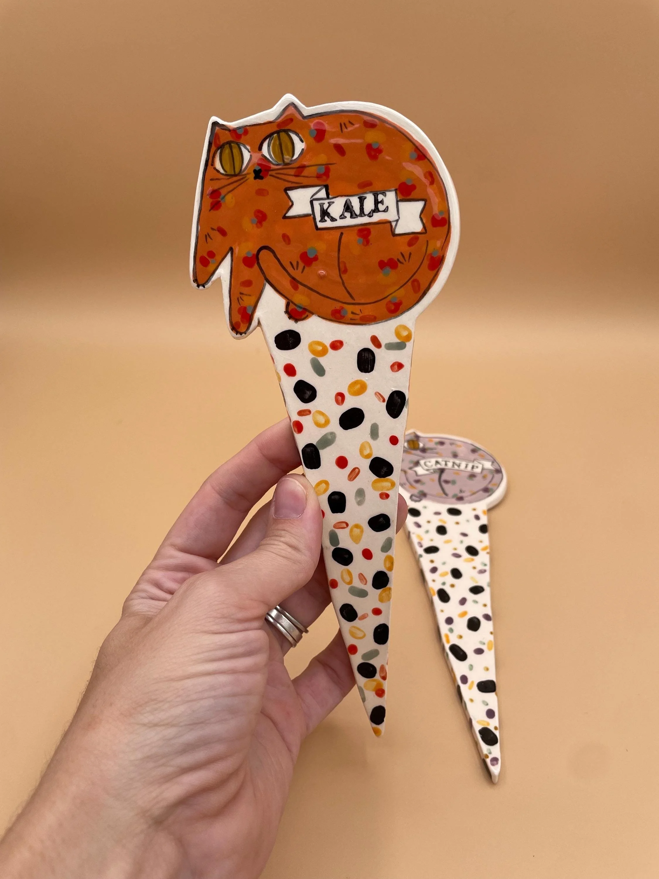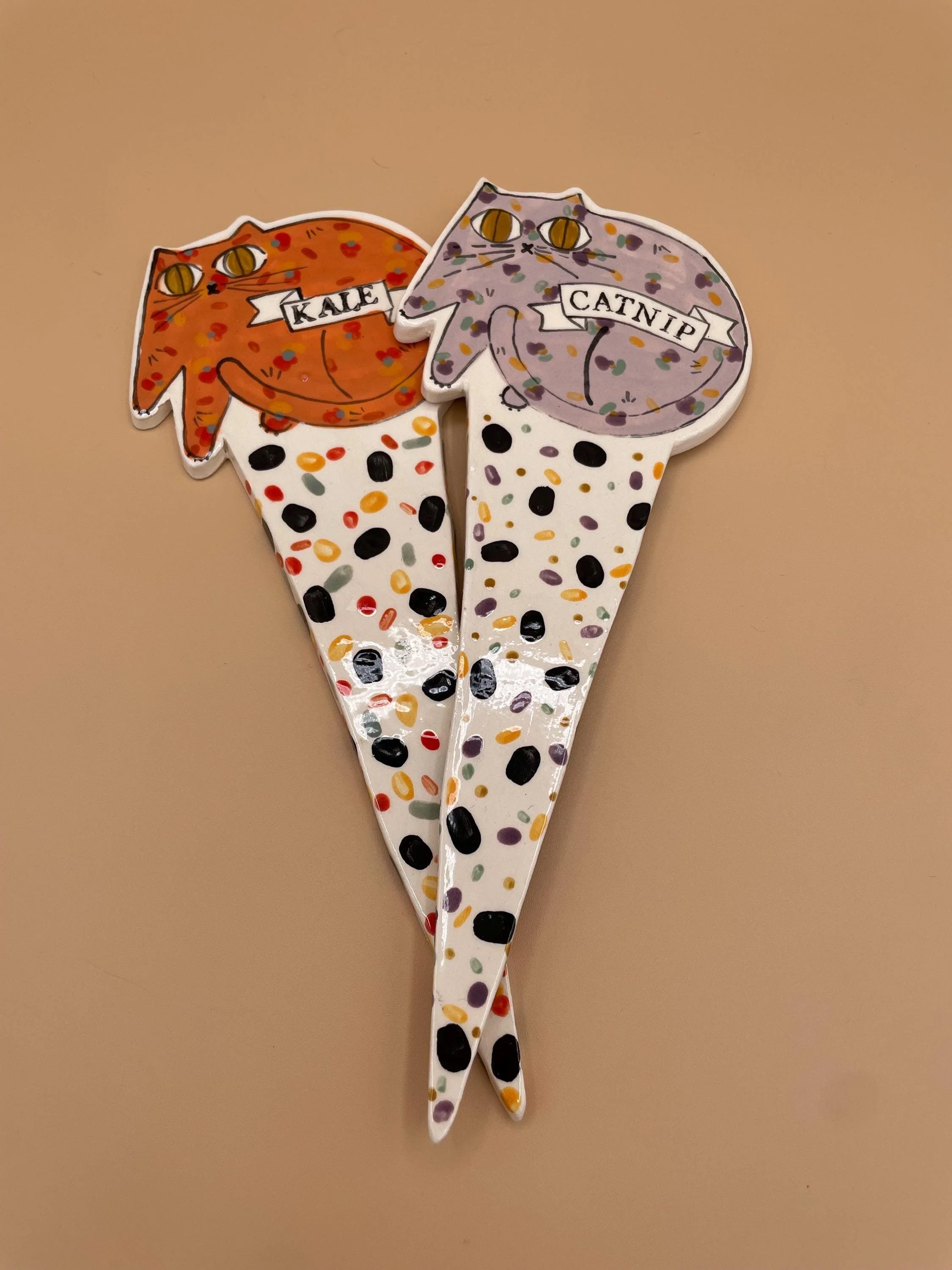 Ceramic Cat Garden Stakes "Catnip" and "Kale" For indoor or Outdoor use.