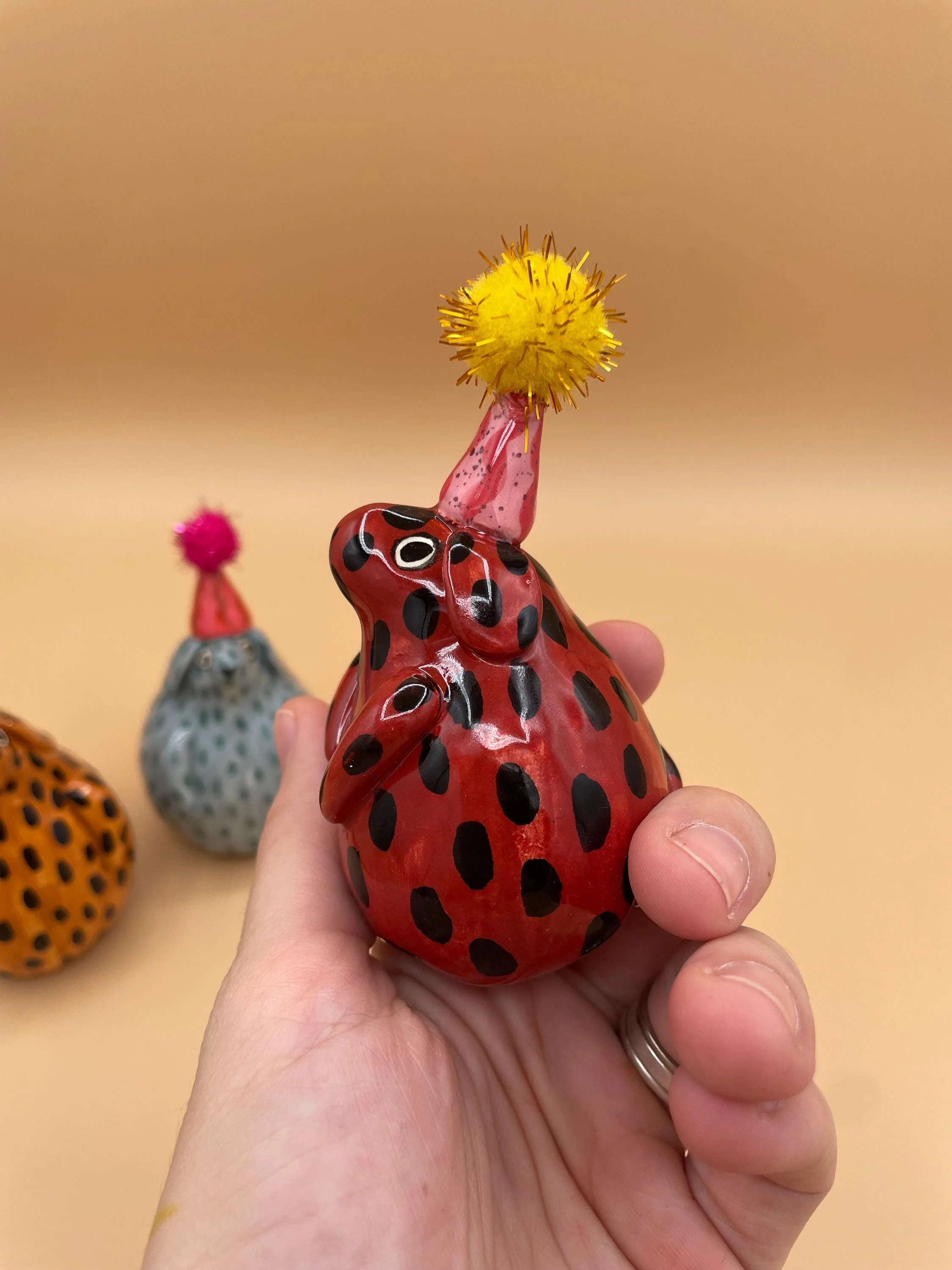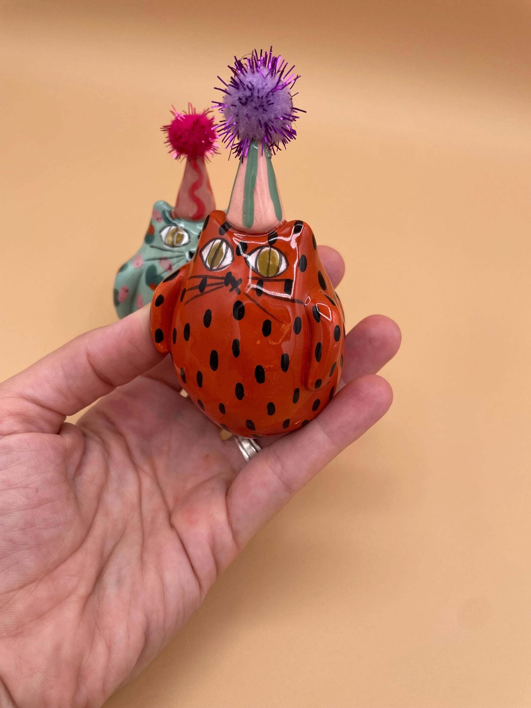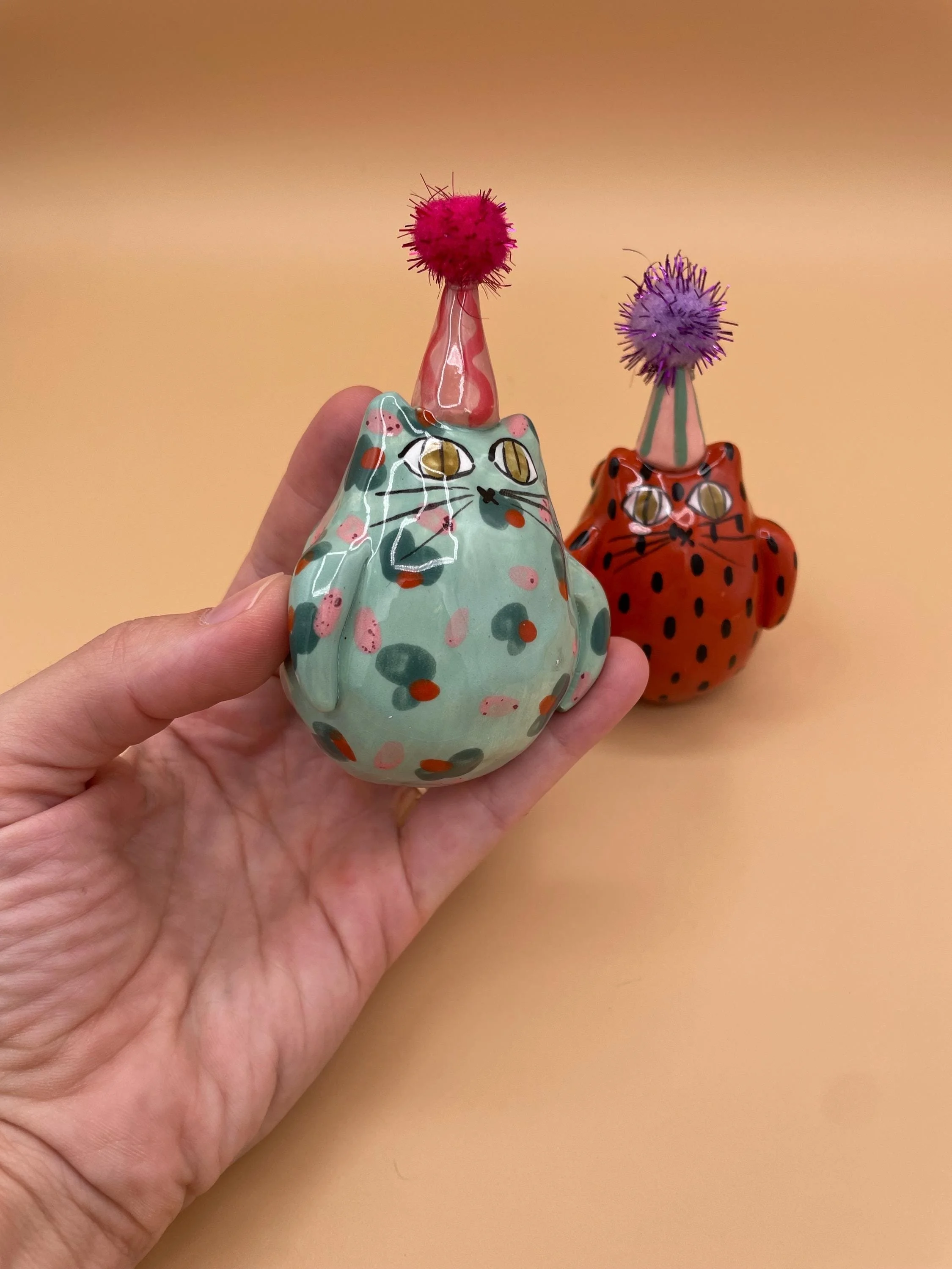 These whimsical **polka dot cat maracas** feature two chubby kitties ready to party, each wearing a colorful striped party hat topped with a fluffy pom-pom (one hot pink, one lavender with sparkly tinsel). Hand-painted with bold black spots on vibrant bases – one soft mint green with multicolored accents, the other bright red – they have wide golden eyes, whiskered faces, and that irresistible folk-art charm. Give them a gentle shake for a cheerful maraca rattle that's sure to bring smiles!
