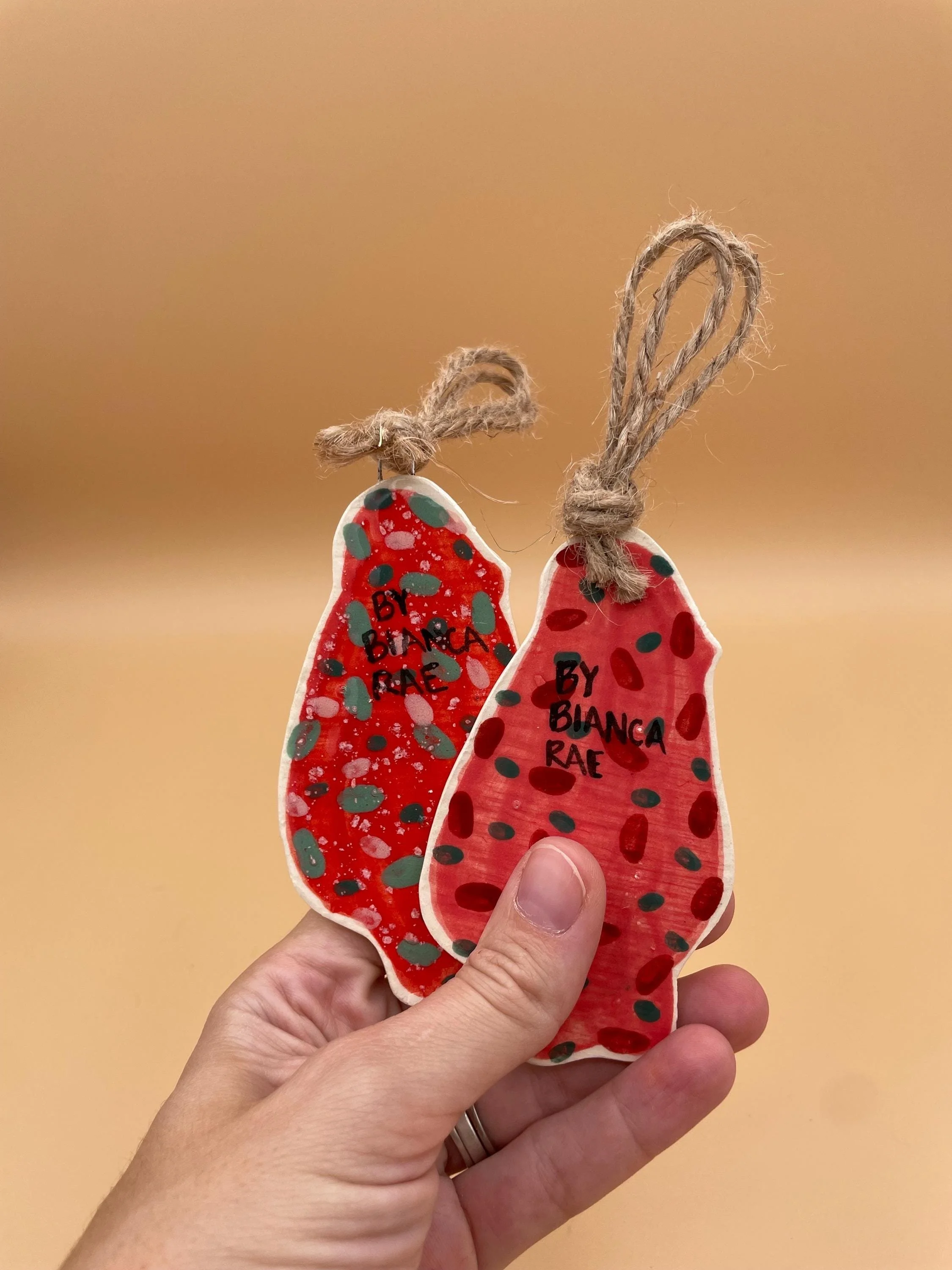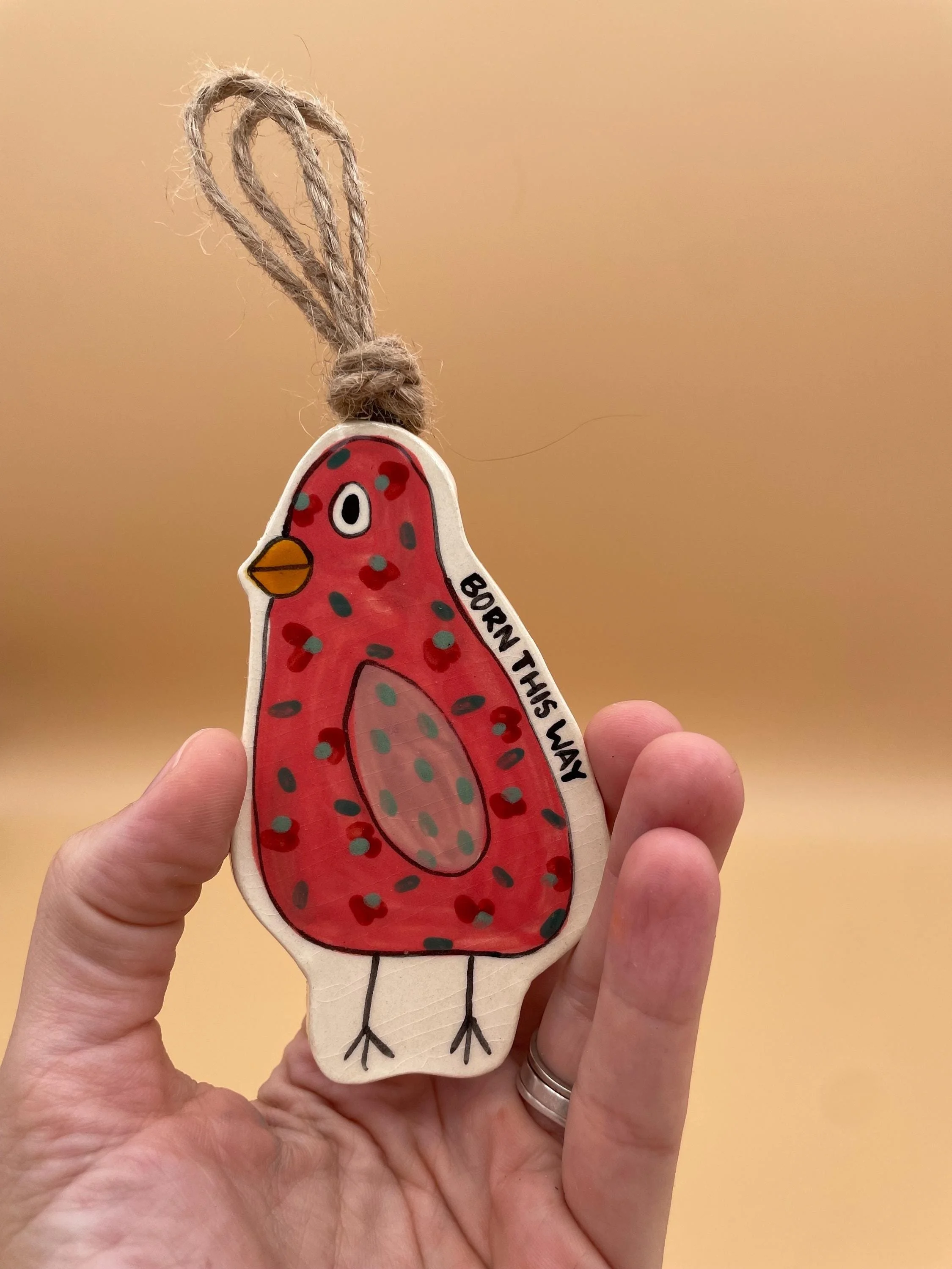 - Each ornament is one-of-a-kind – slight variations in painting, spotting, and feather placement add to the handmade charm