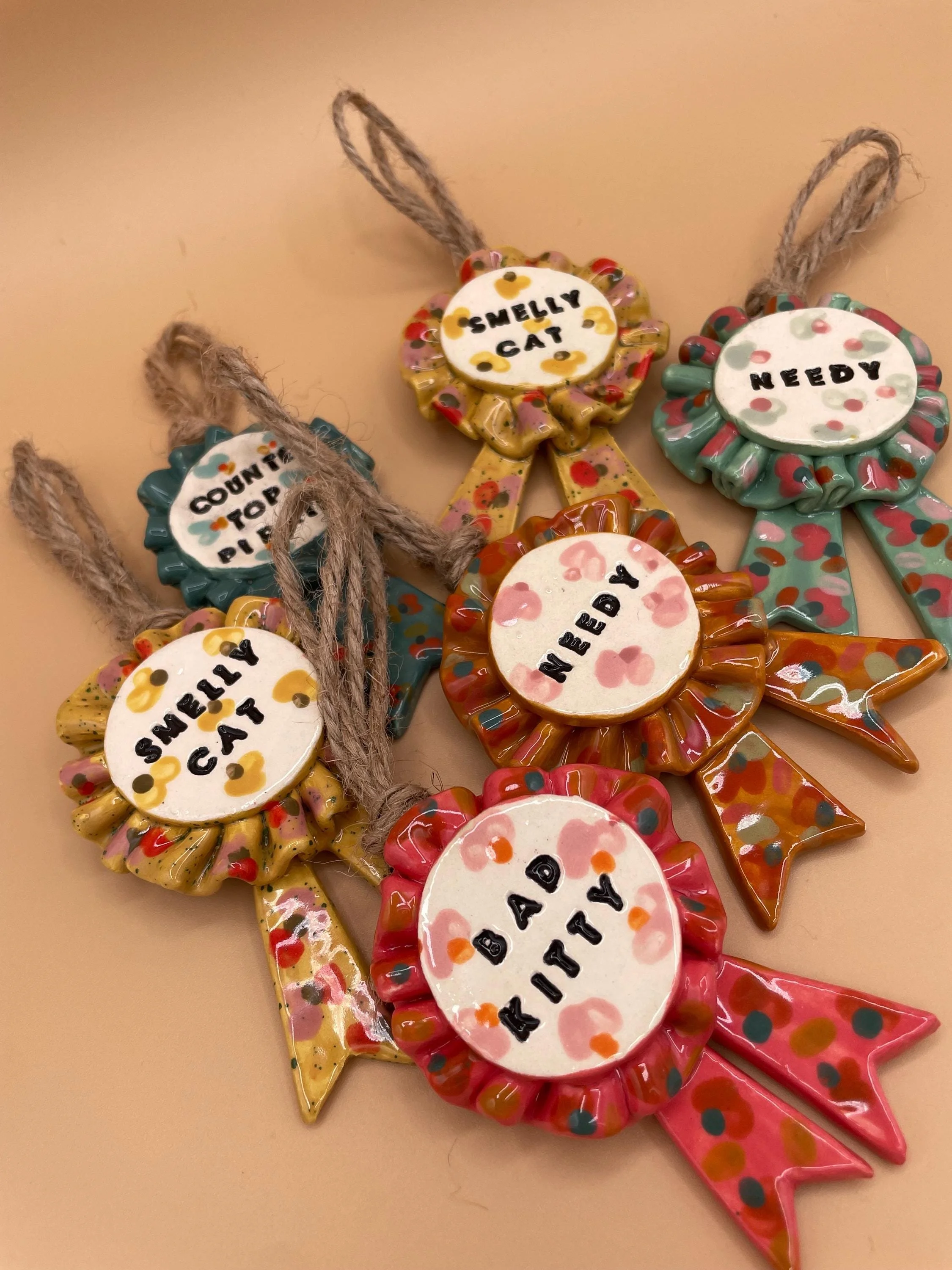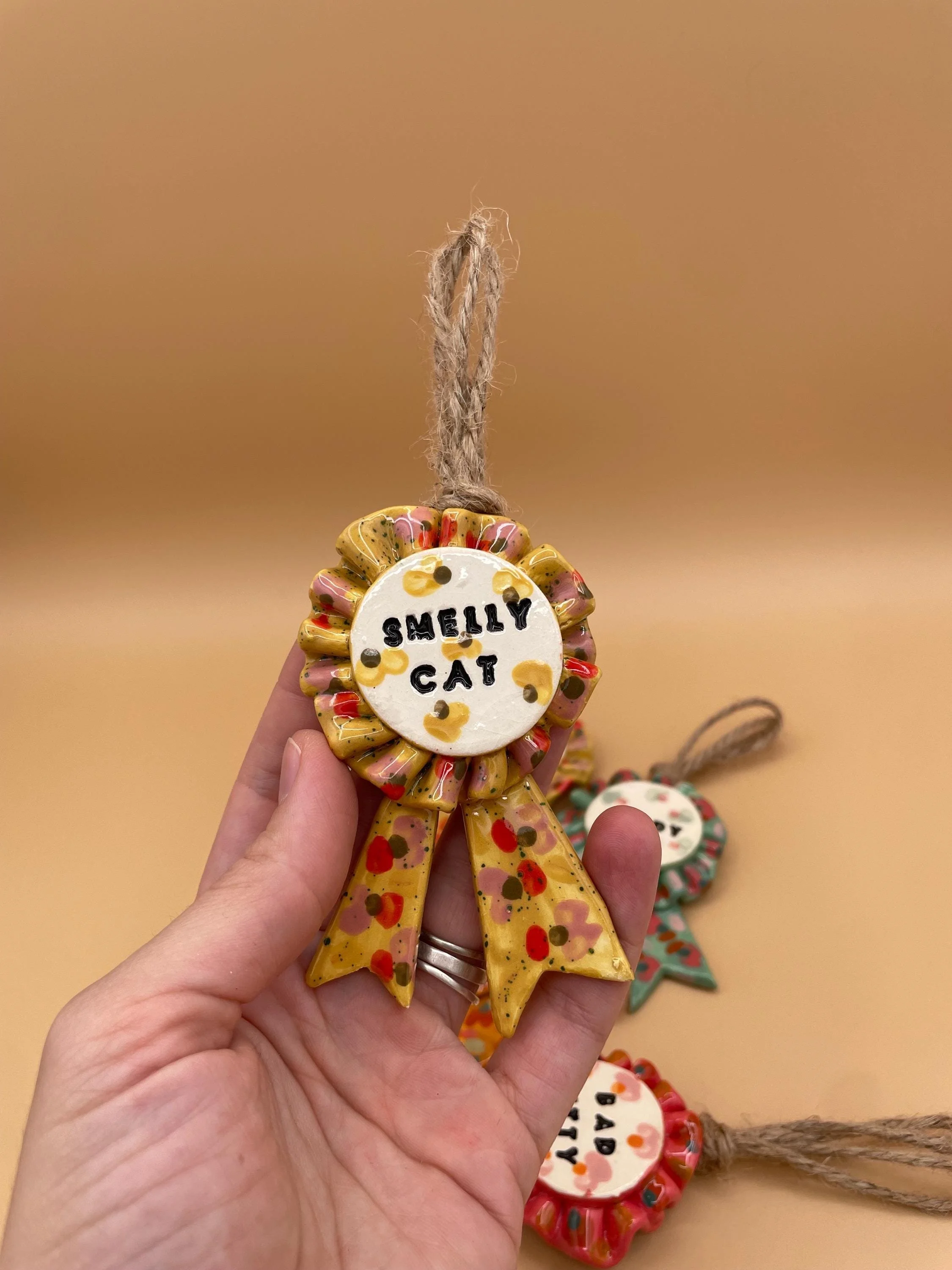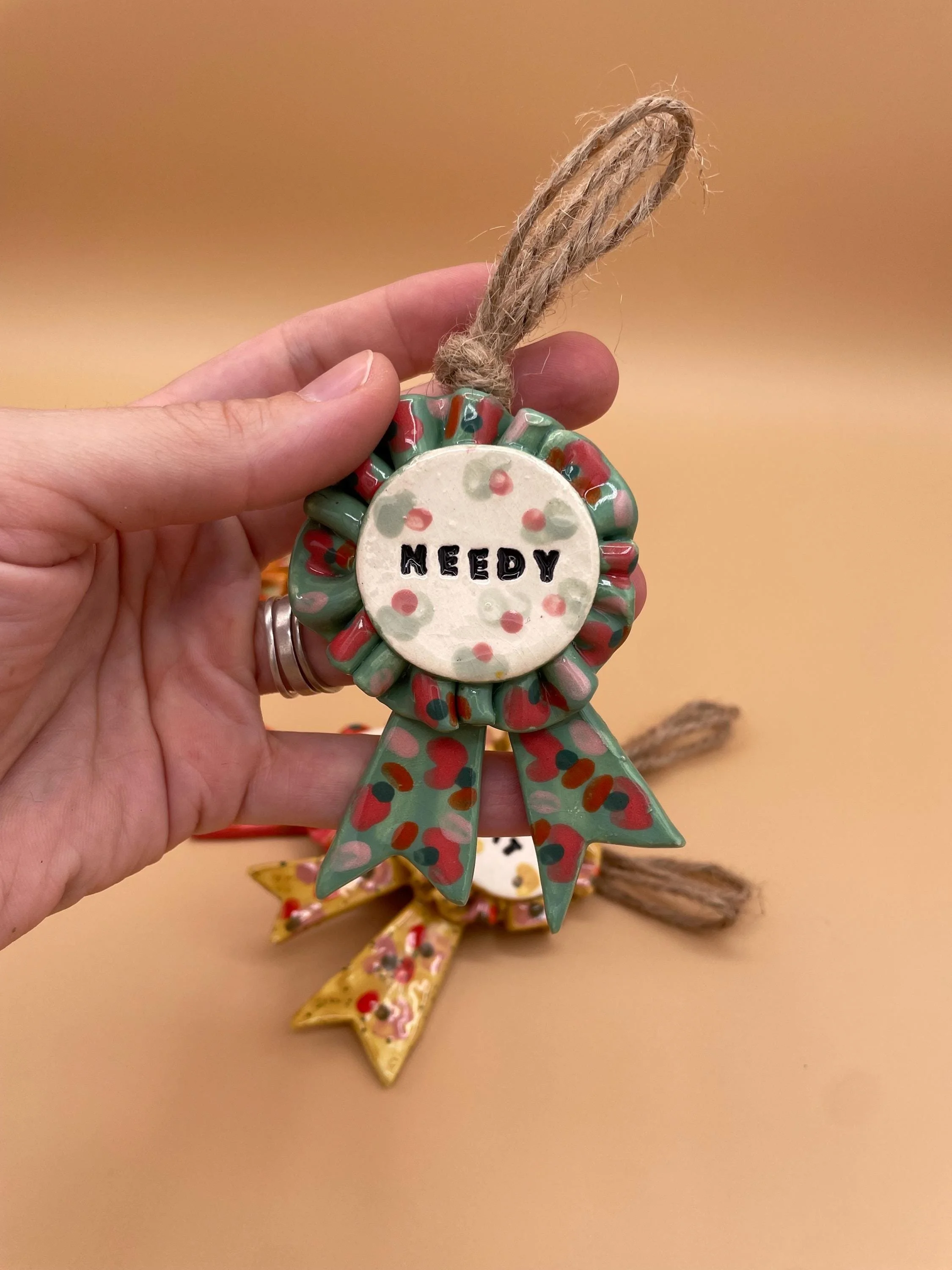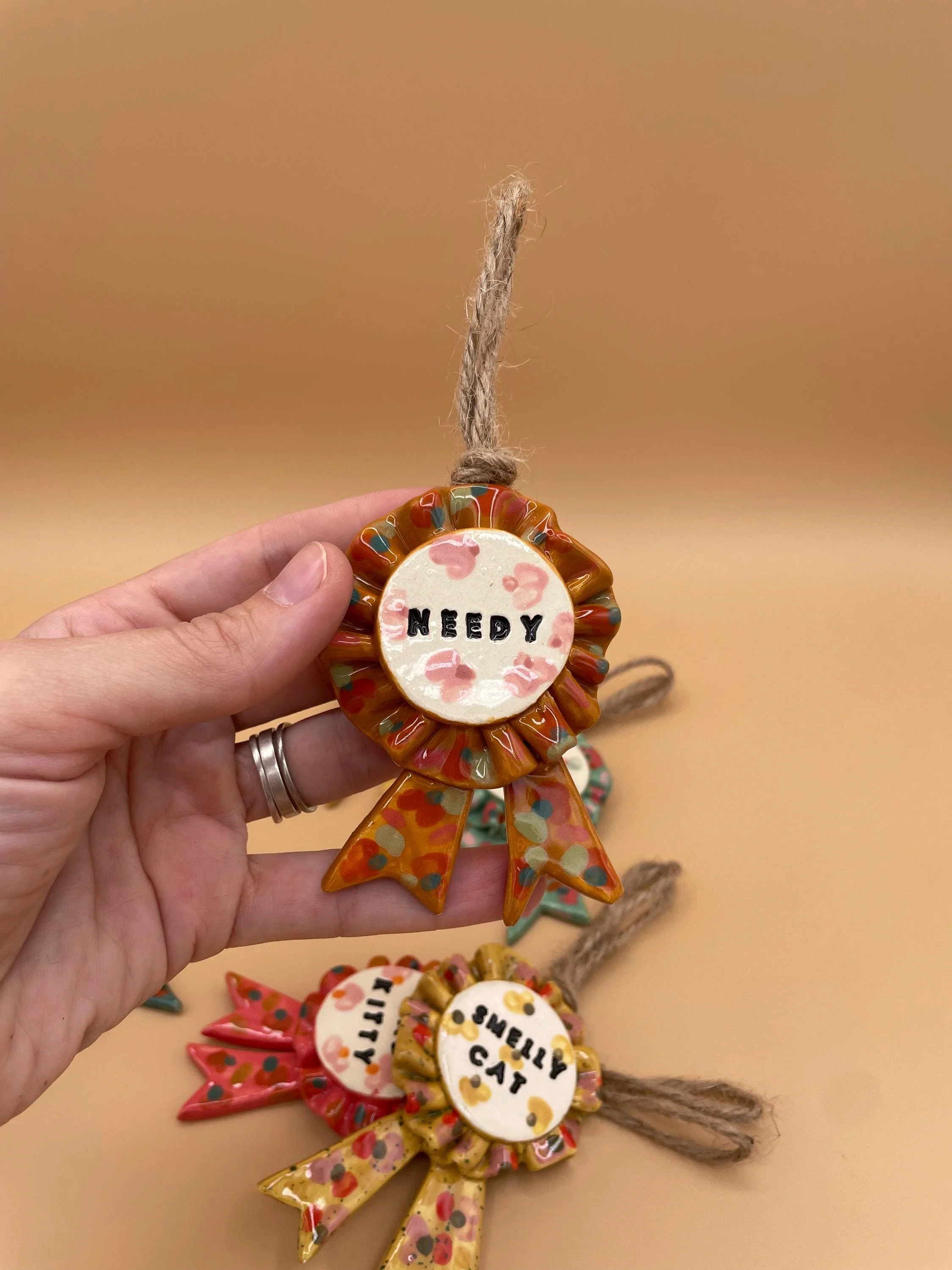 - Handmade from low fire ceramic clay with mixed media (faux feathers and fuzzy fibers)