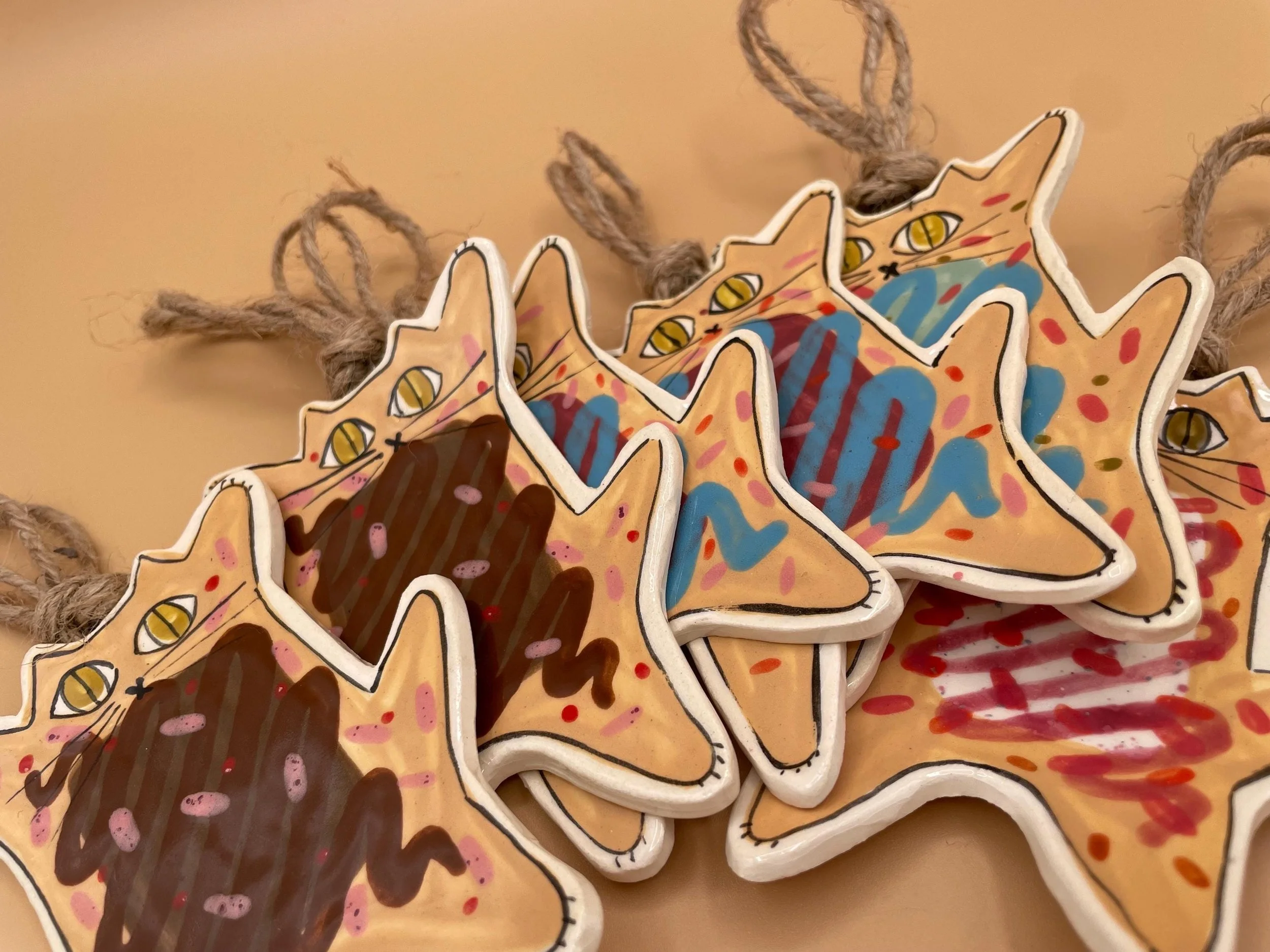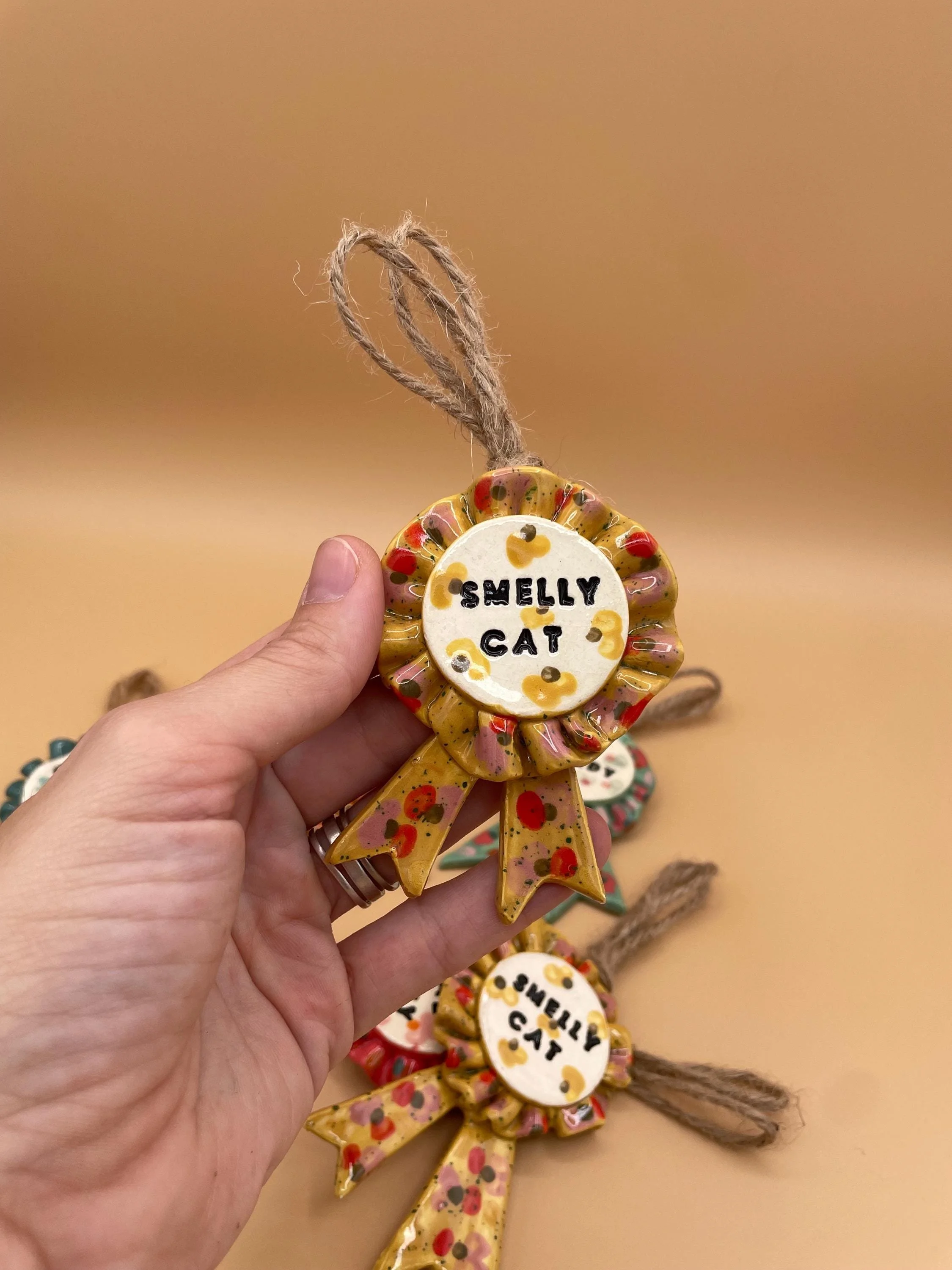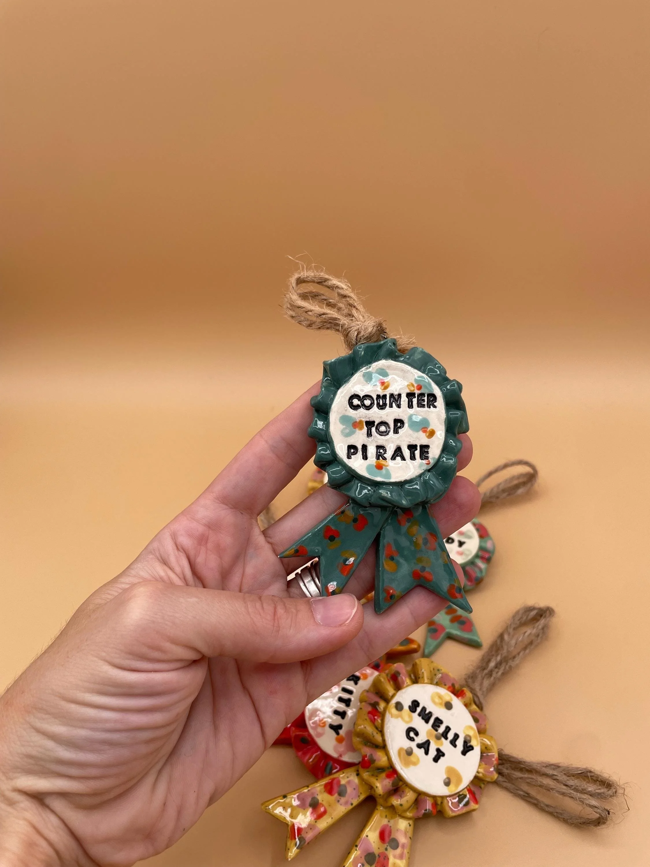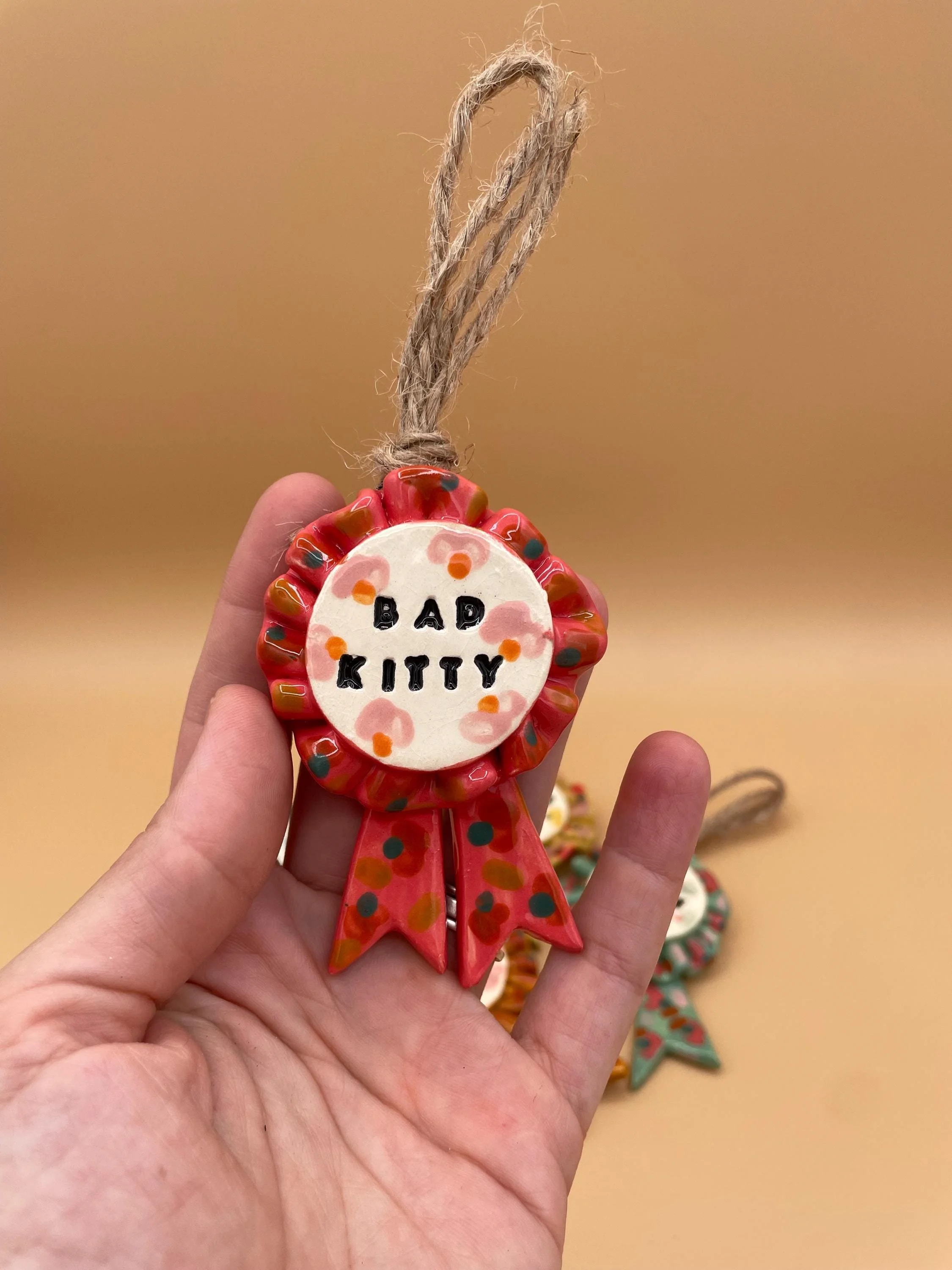 - Handmade from low fire ceramic clay with mixed media (faux feathers and fuzzy fibers)