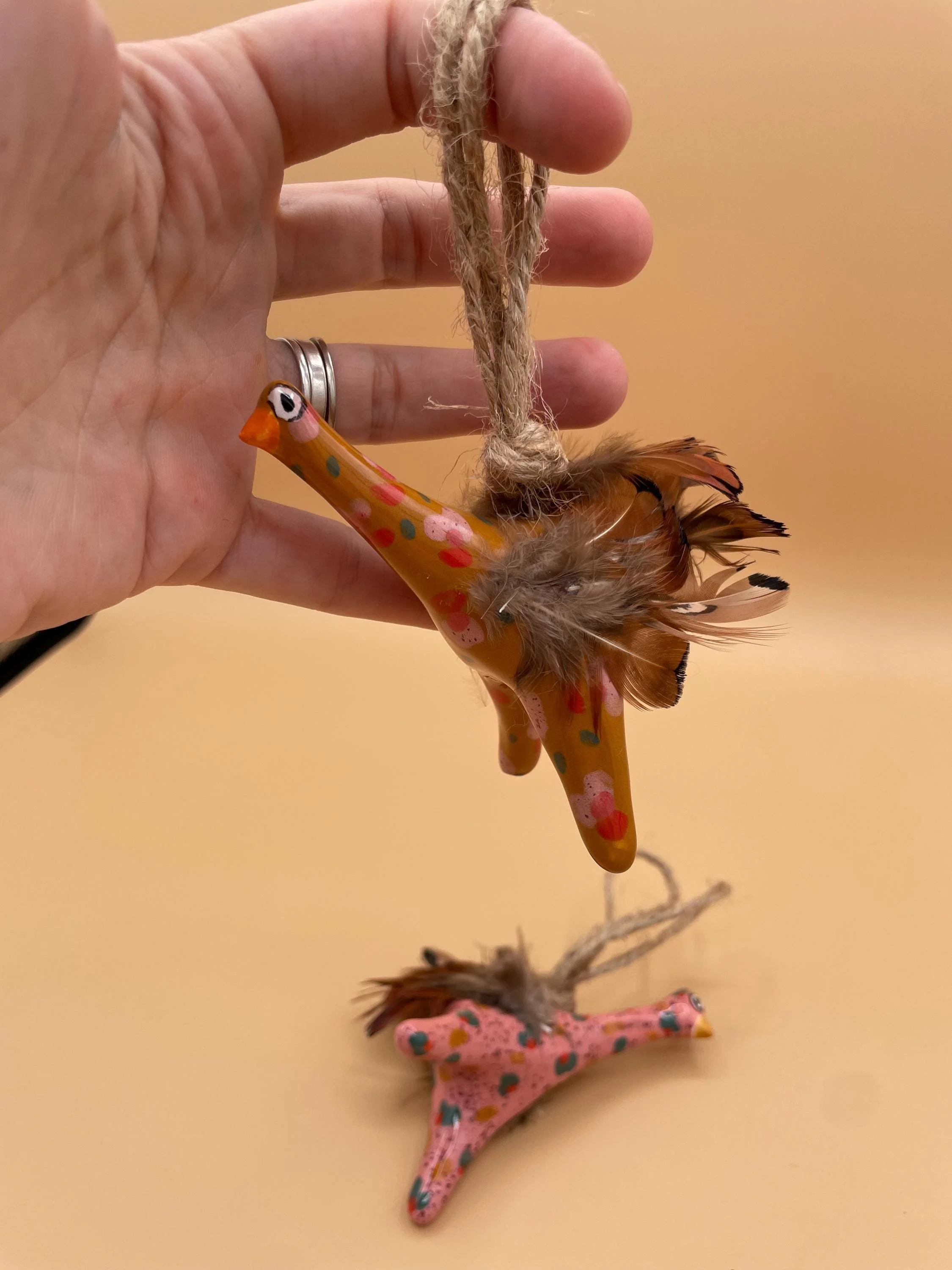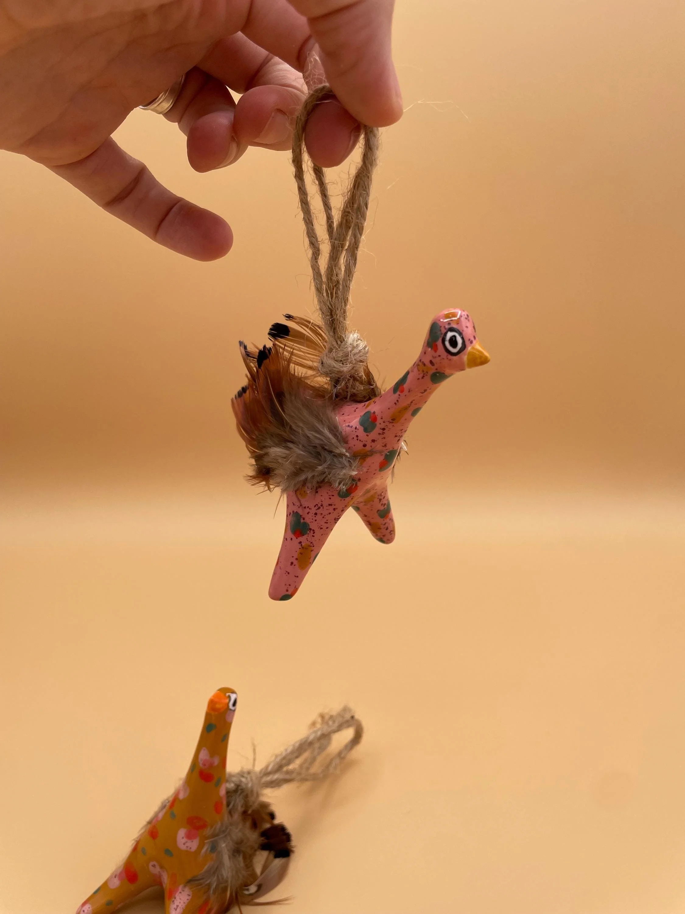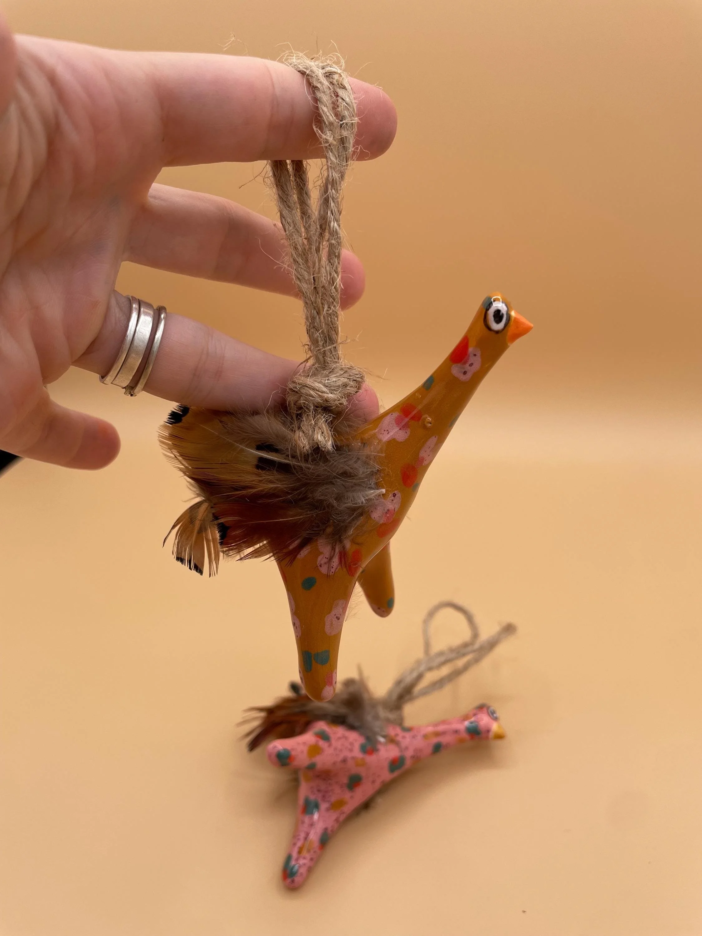 This playful pair of long-necked bird ornaments features two goofy, googly-eyed creatures with exaggerated necks and legs, hand-sculpted from ceramic clay and glazed in vibrant mustard yellow and soft pink with colorful confetti polka dots (teal, red, pink, and more). Each bird is adorned with faux feathers for fluffy tails and wild "hair," plus fuzzy accents for extra texture and personality. Ready to hang with natural twine loops, these lightweight cuties dangle with hilarious movement and folk-art flair.