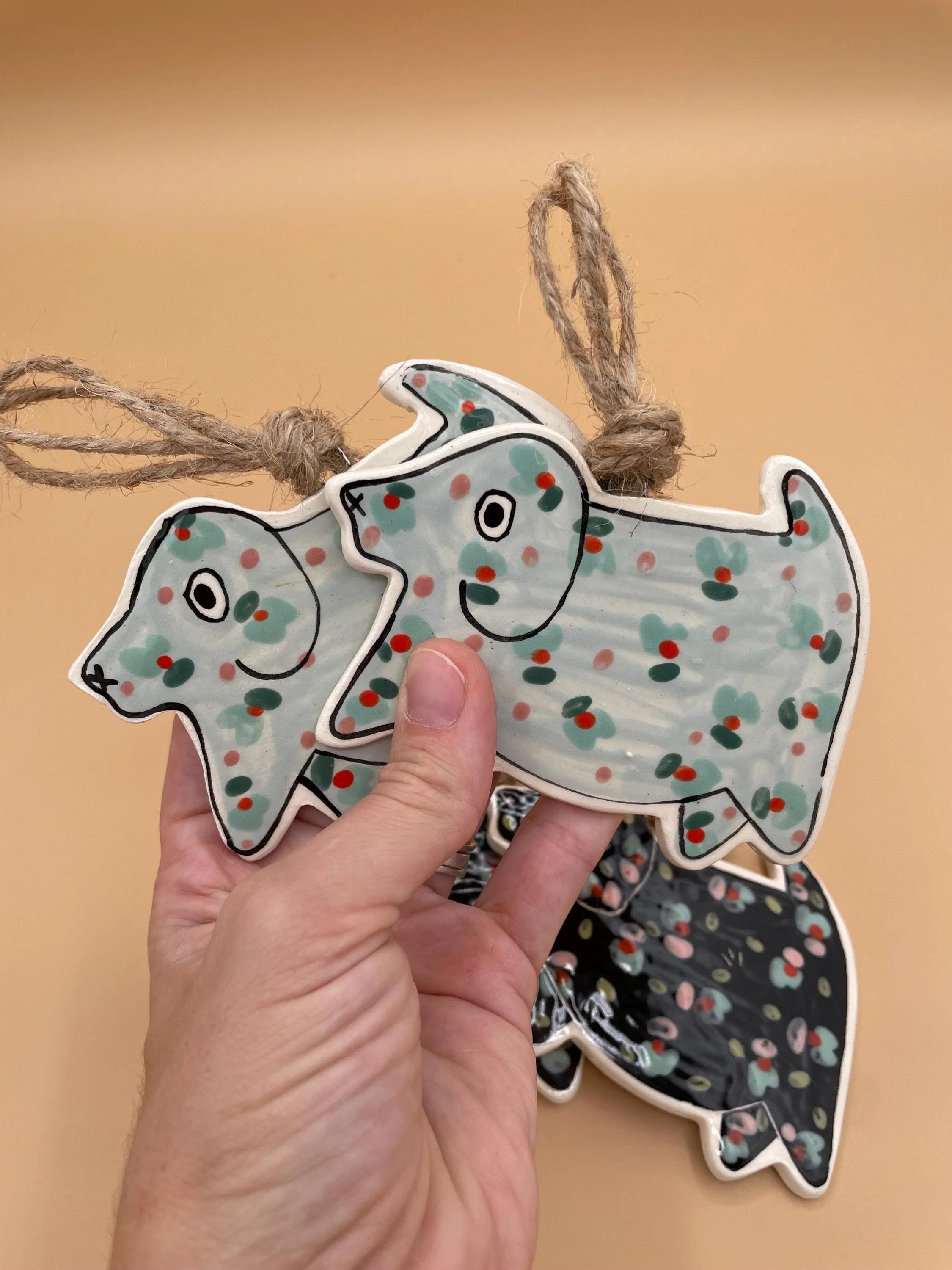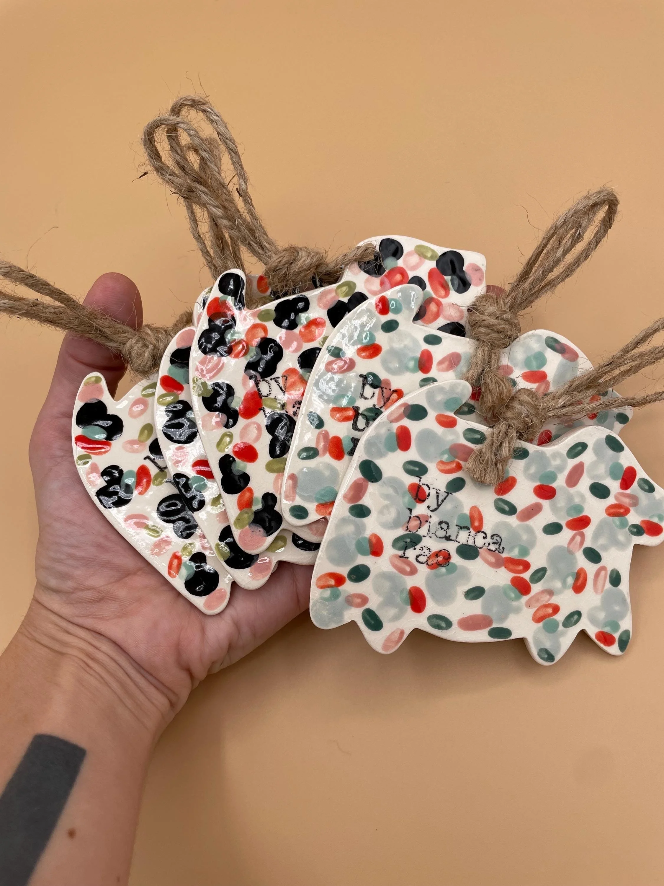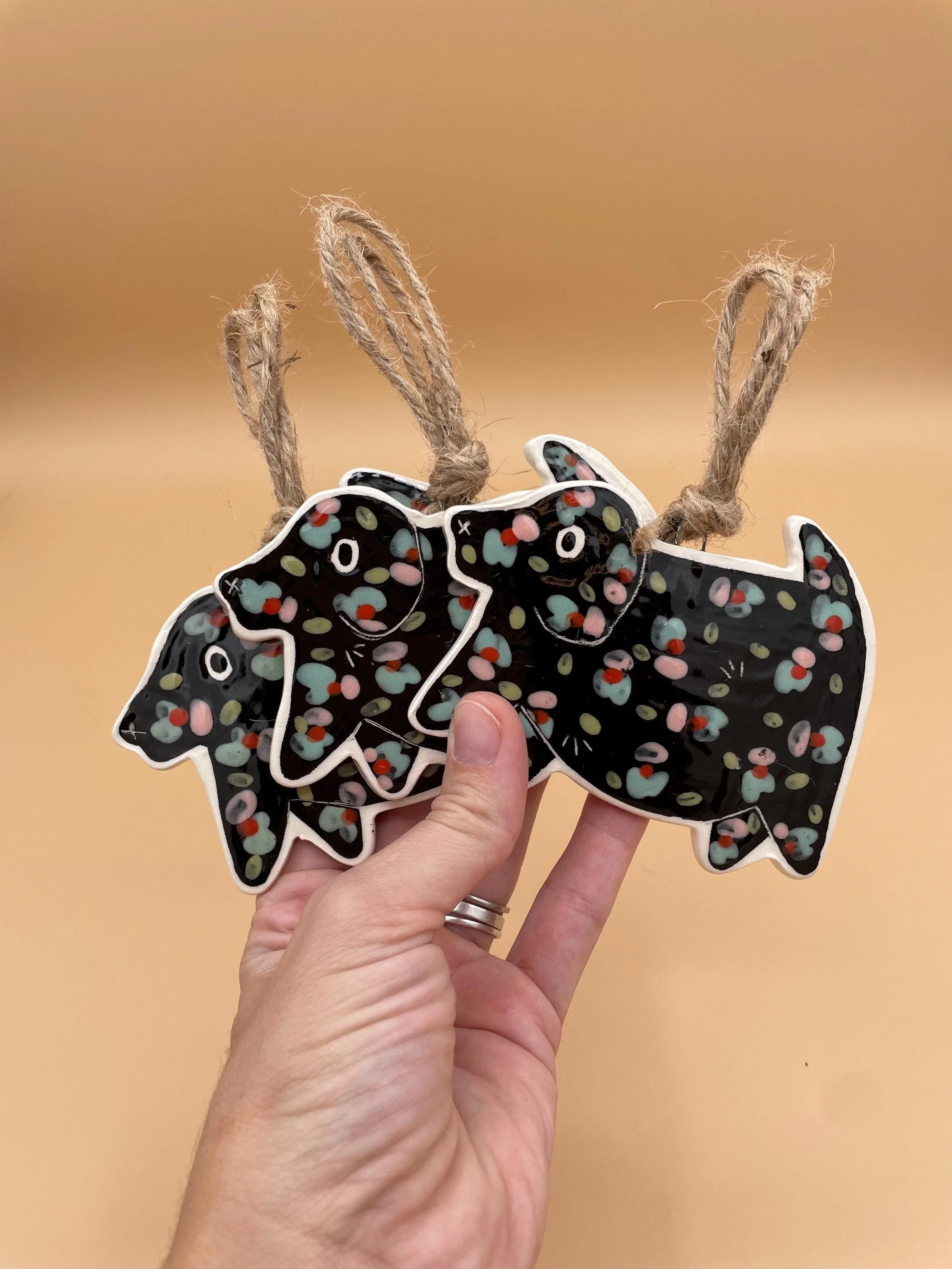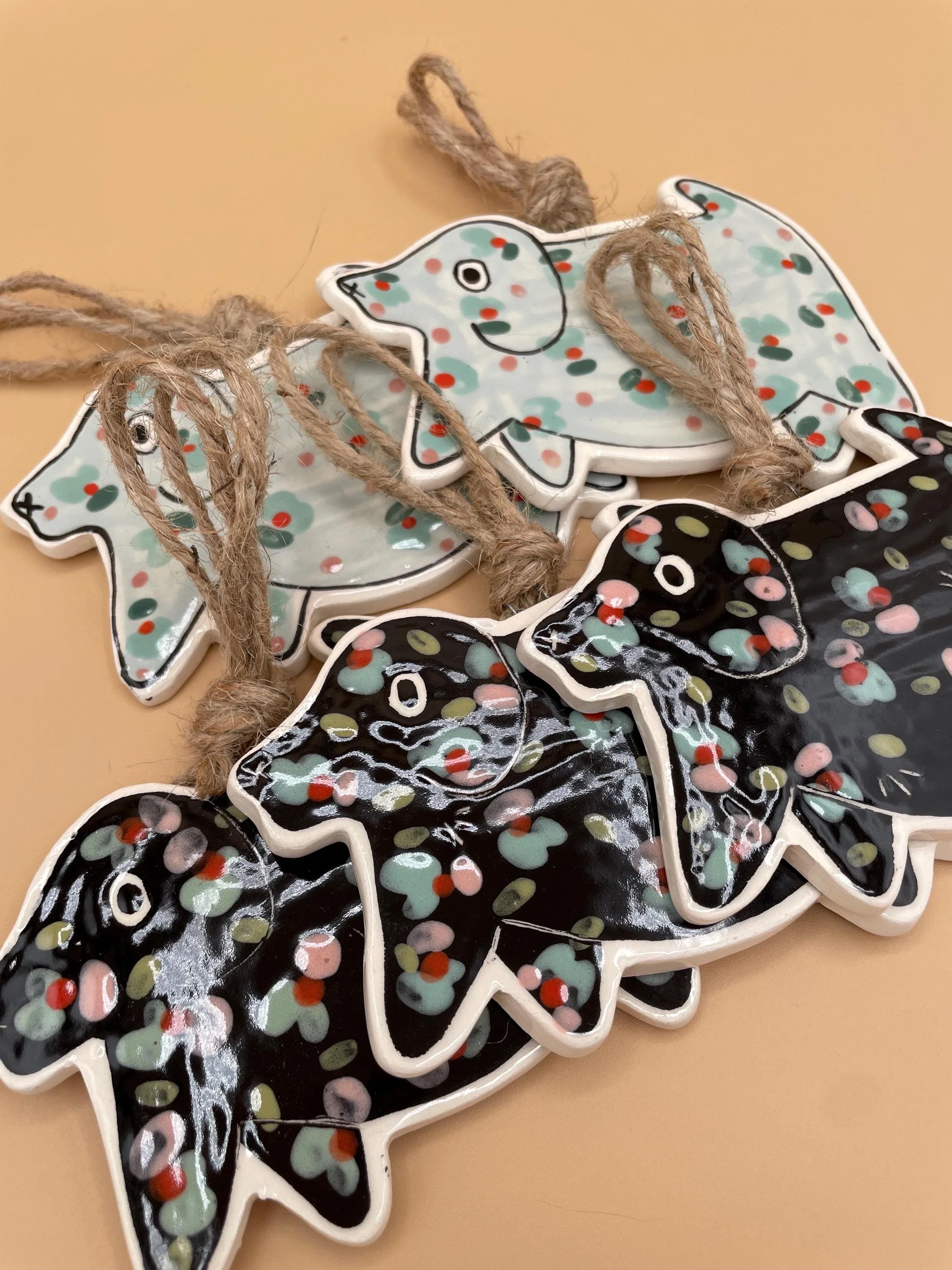This cheeky collection of cat award ribbon ornaments features prize-style rosettes in vibrant colors with ruffled ribbon tails, each topped with a bold white medallion proudly declaring a classic cat trait: "SMELLY CAT", "NEEDY", "BAD KITTY" and "COUNTER TOP PIRATE". Hand-painted with colorful confetti polka dots on glossy glazes, they're full of playful folk-art charm and ready to hang with natural twine loops. Perfect for embracing the messy, demanding, and utterly lovable reality of life with cats!