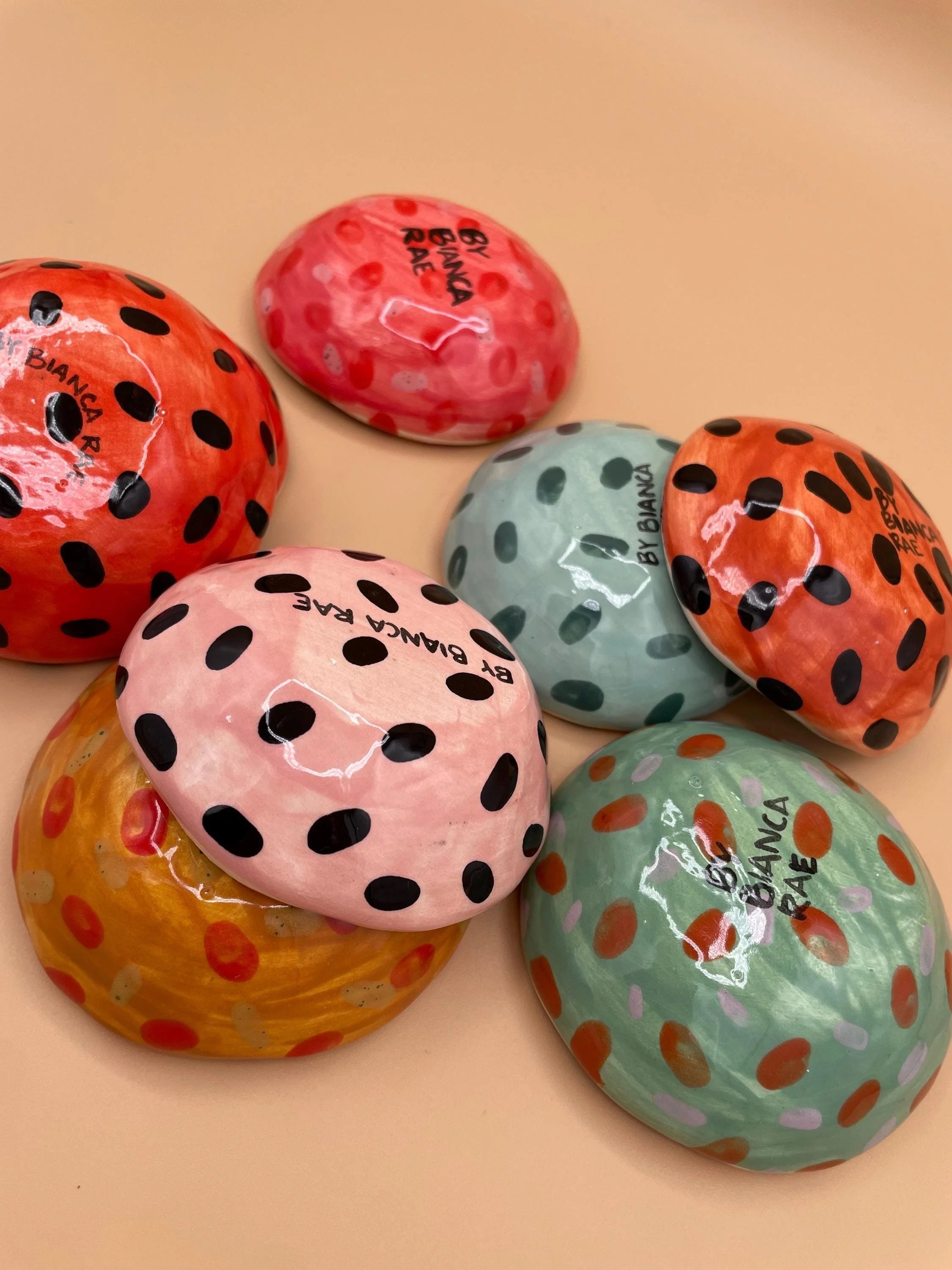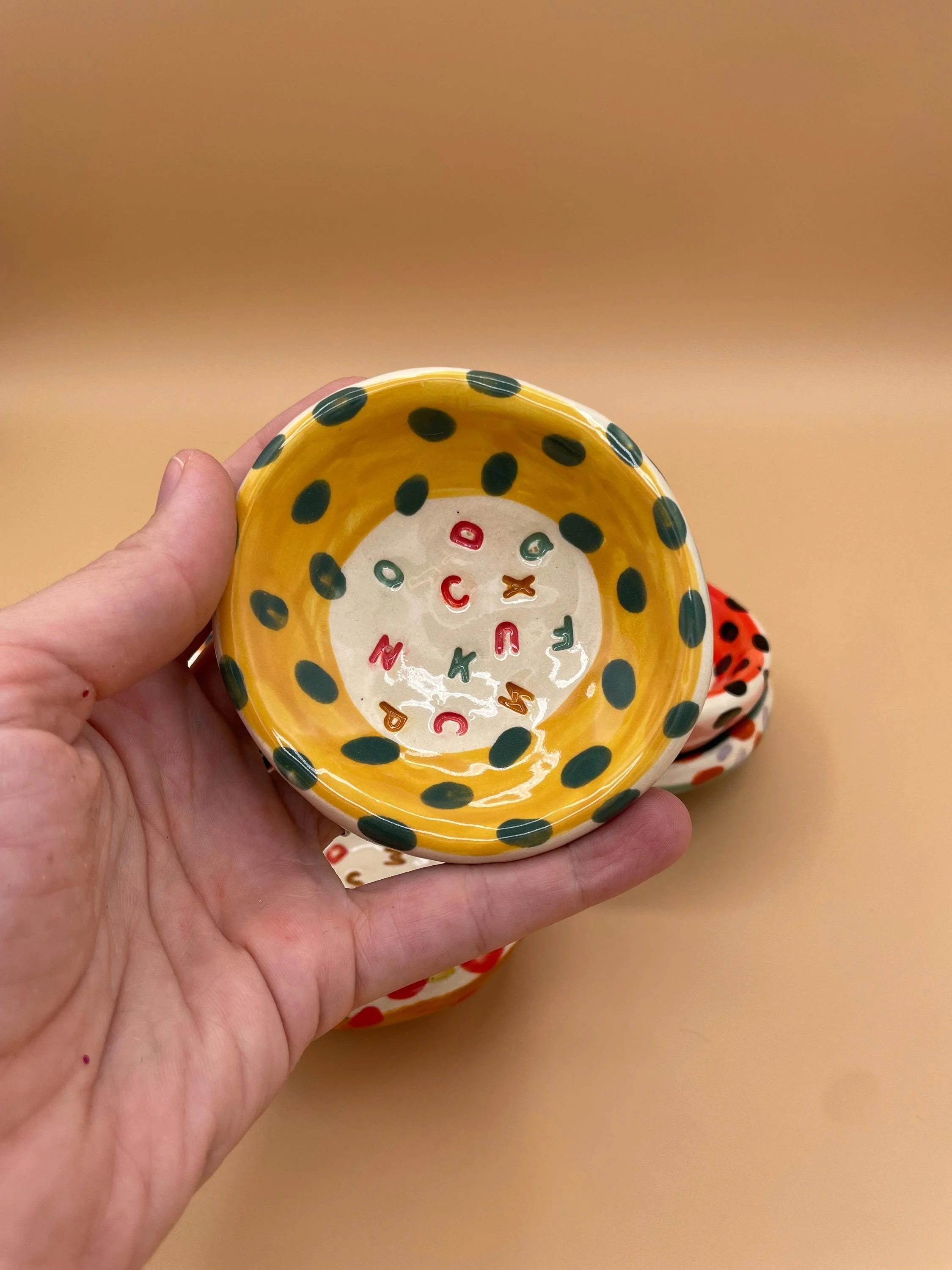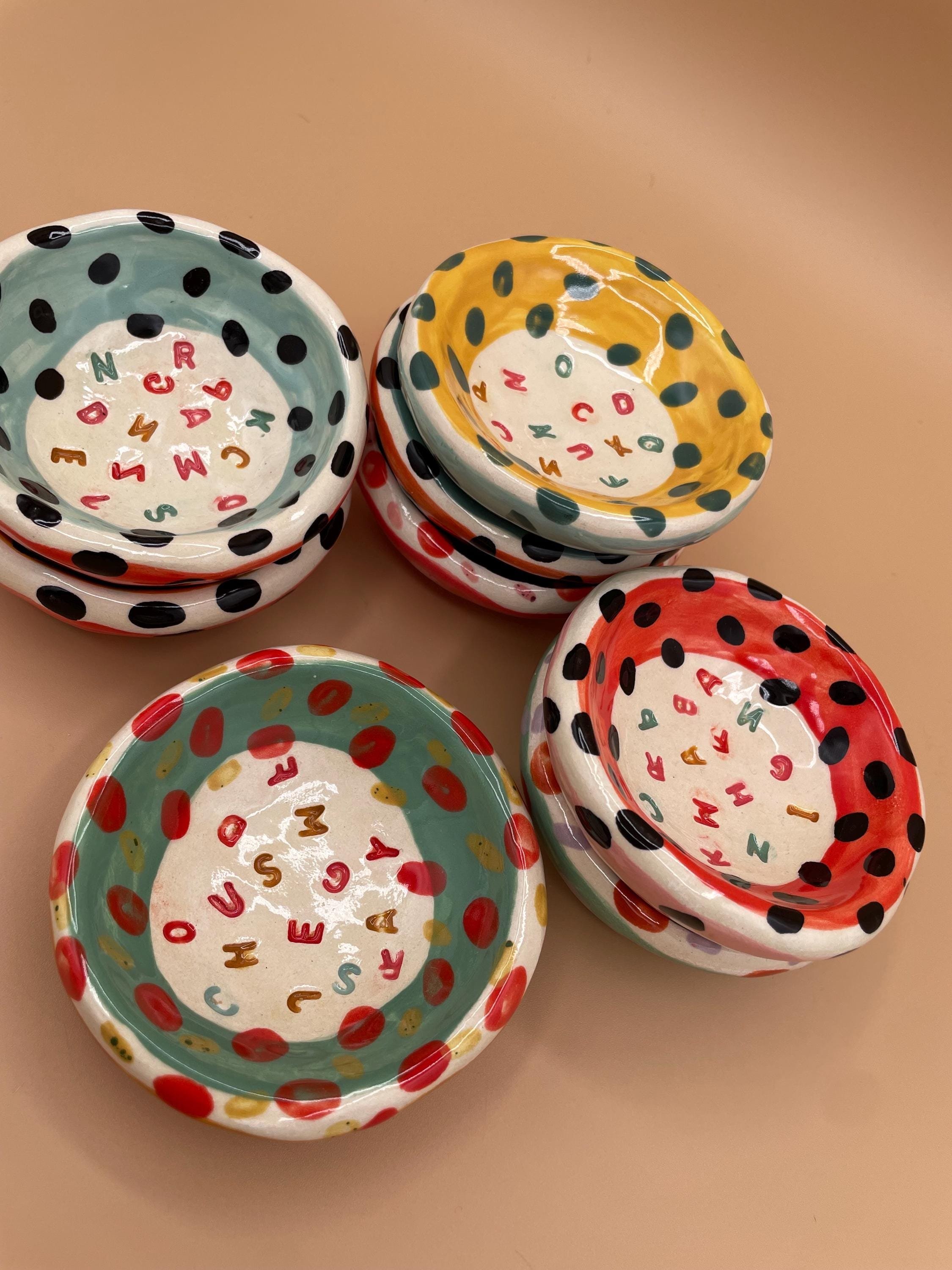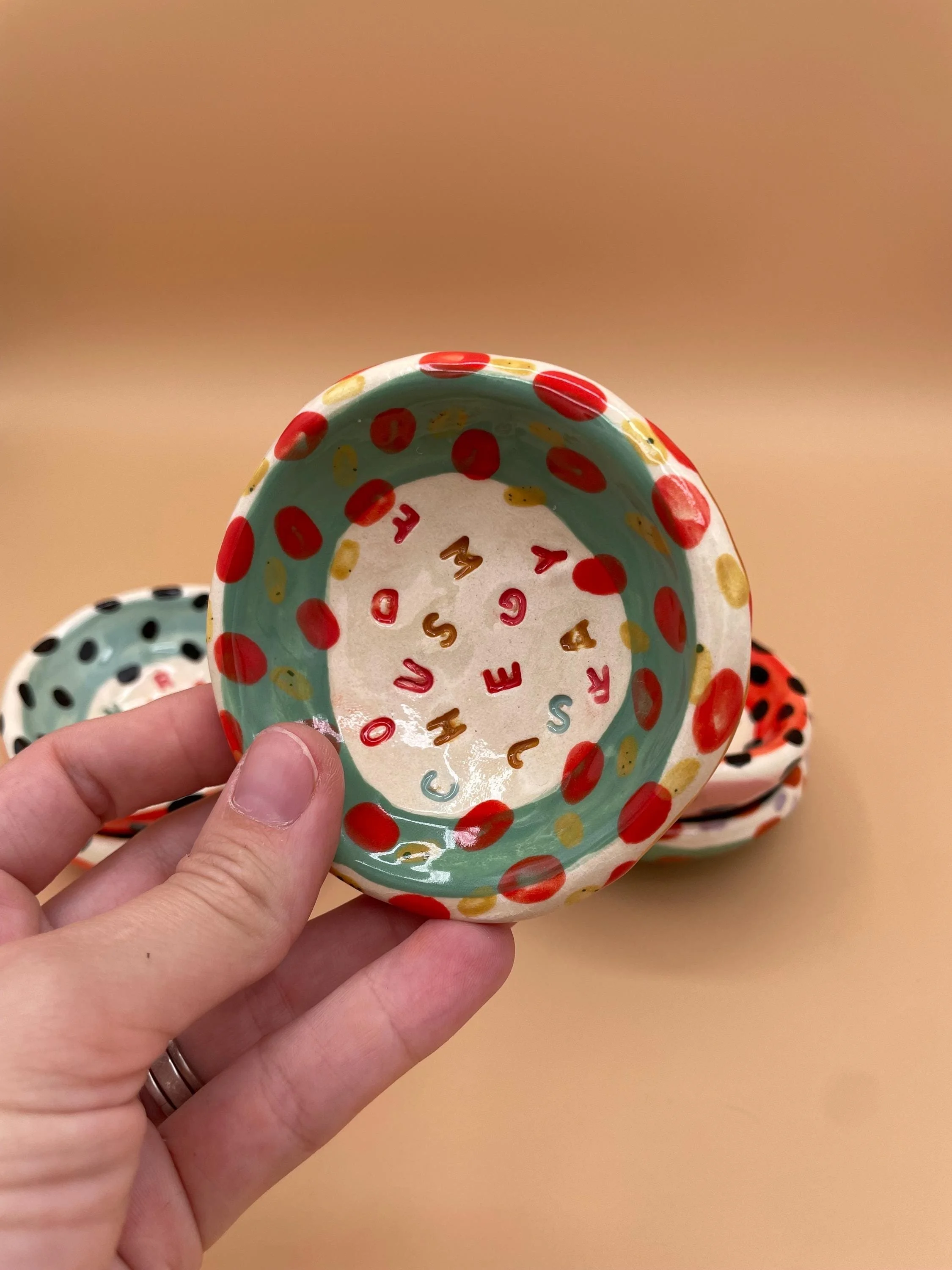 Details: - Handmade from low fire ceramic clay - Hand-stamped lettering with real alphabet soup noodles and hand-painted details - Food-safe, glossy glaze - Approximately 3 inches in diameter, shallow soup bowl shape - Each bowl is one-of-a-kind – slight variations in lettering placement, color intensity, and polka dots add to the handmade appeal - Sold individually (choose your favorite from the drop down menu at checkout) -Cost includes shipping :)