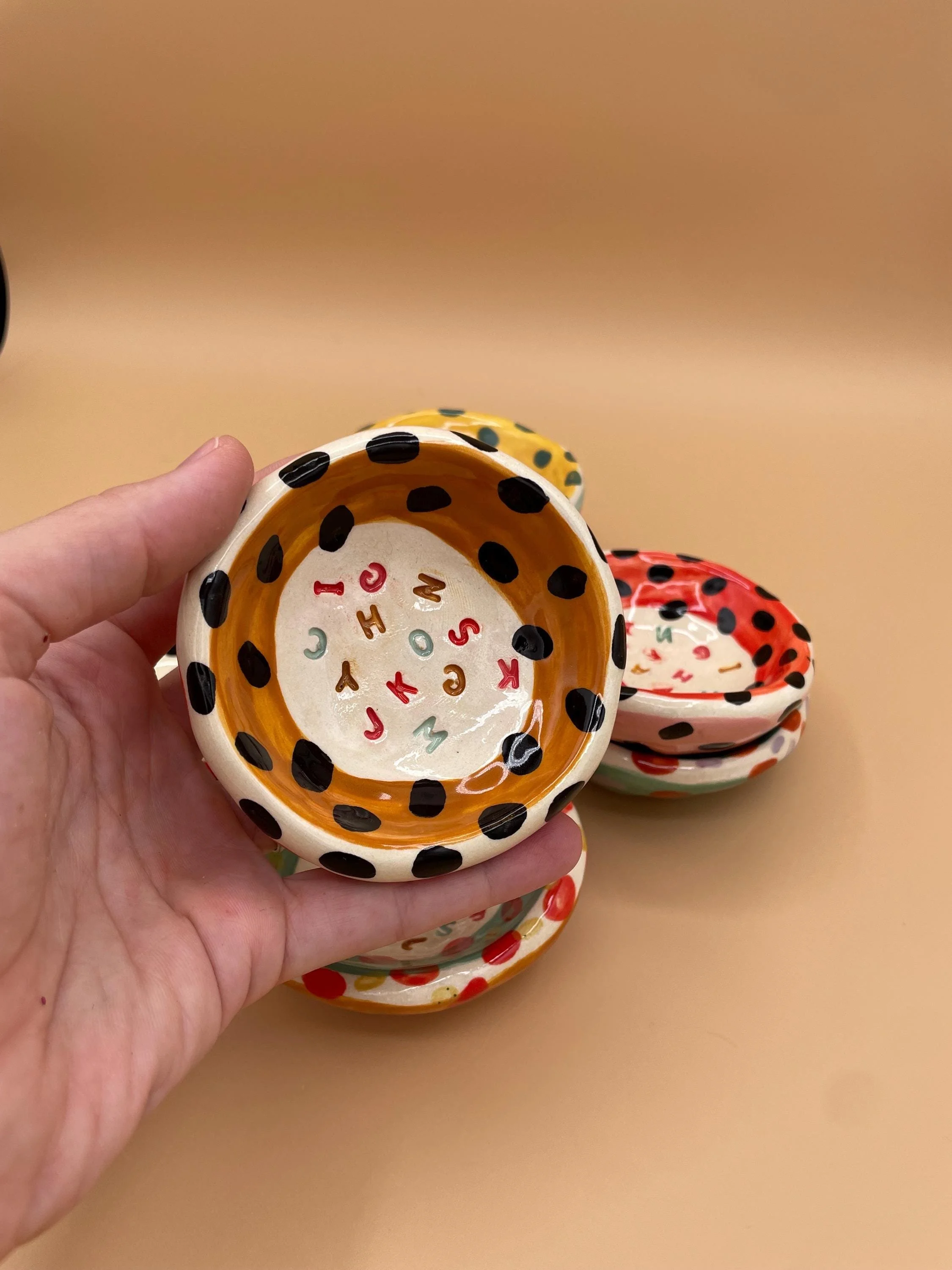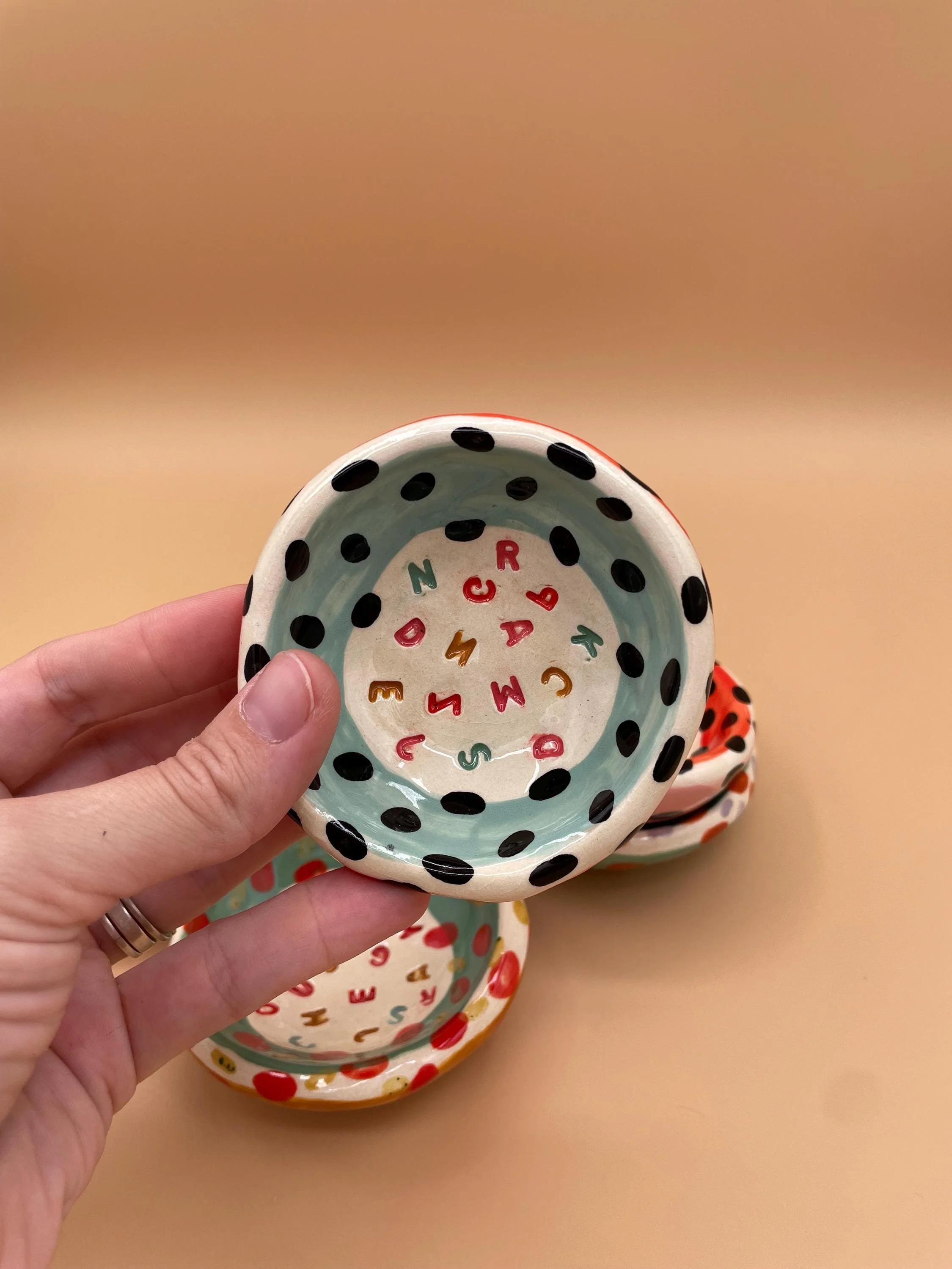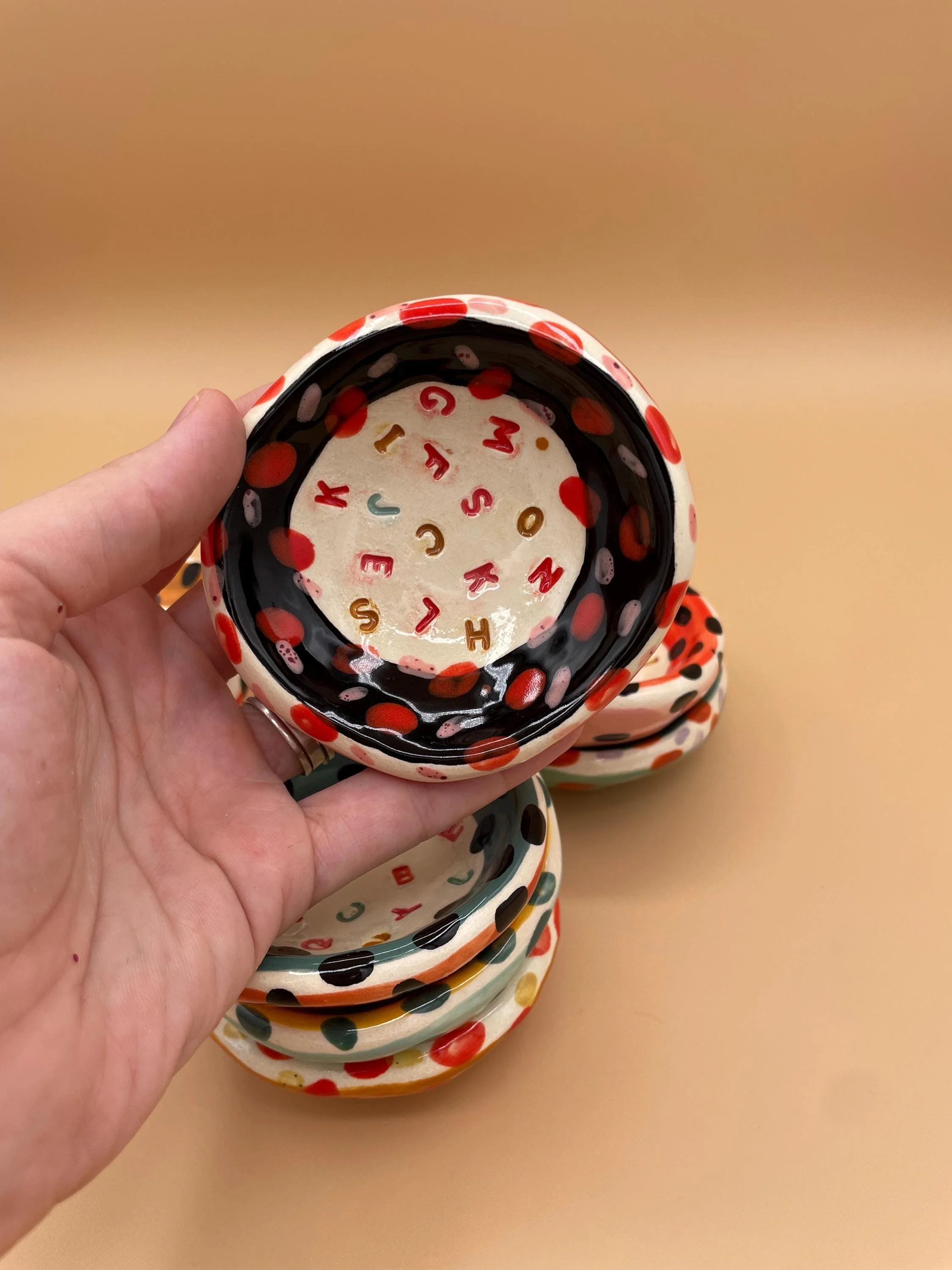 This whimsical group of full patterned, mini alphabet soup bowls features shallow, wide dishes perfect for jewelry, change, trinkets or snacks. Each bowl has a glossy white center with real alphabet soup letters that have been impressed and hand painted in a variety of colors. Each group of random letters is surrounded by bold black polka dots on vibrant rims in teal, yellow, red, pink, and mint. Hand-painted with cheerful confetti accents and glossy food-safe glazes, they're full of folk-art charm and sure to spark smiles anywhere they are displayed.