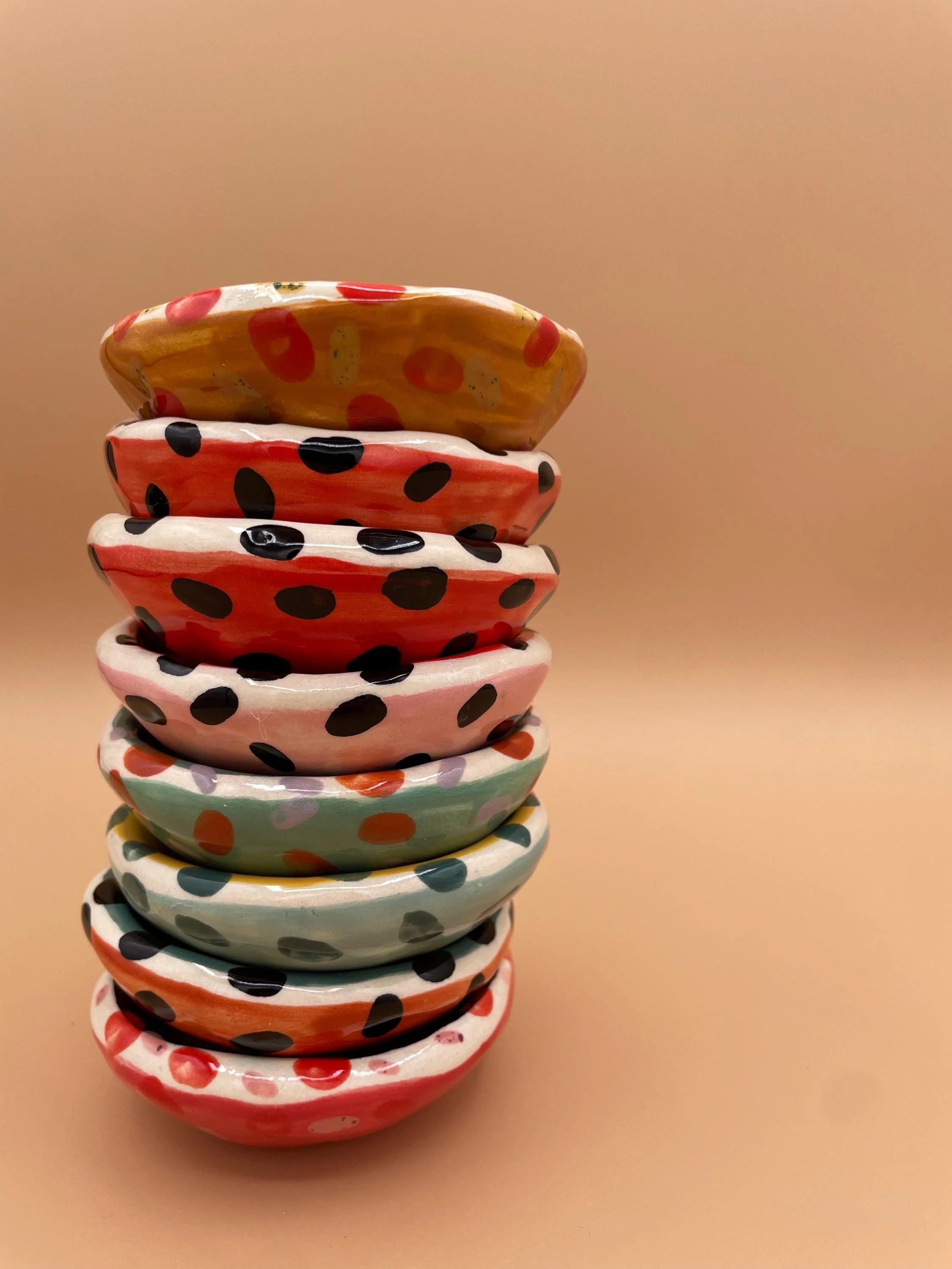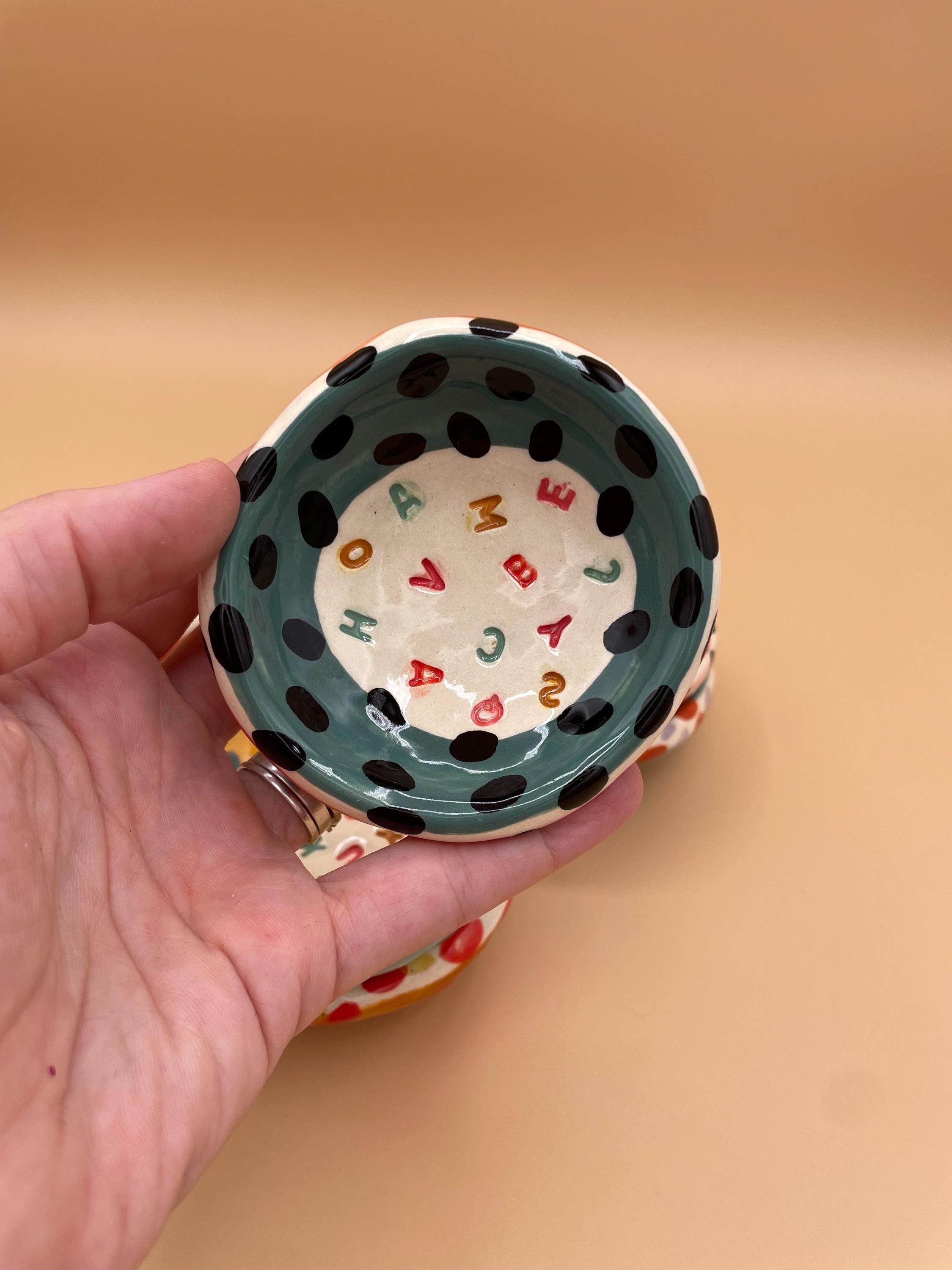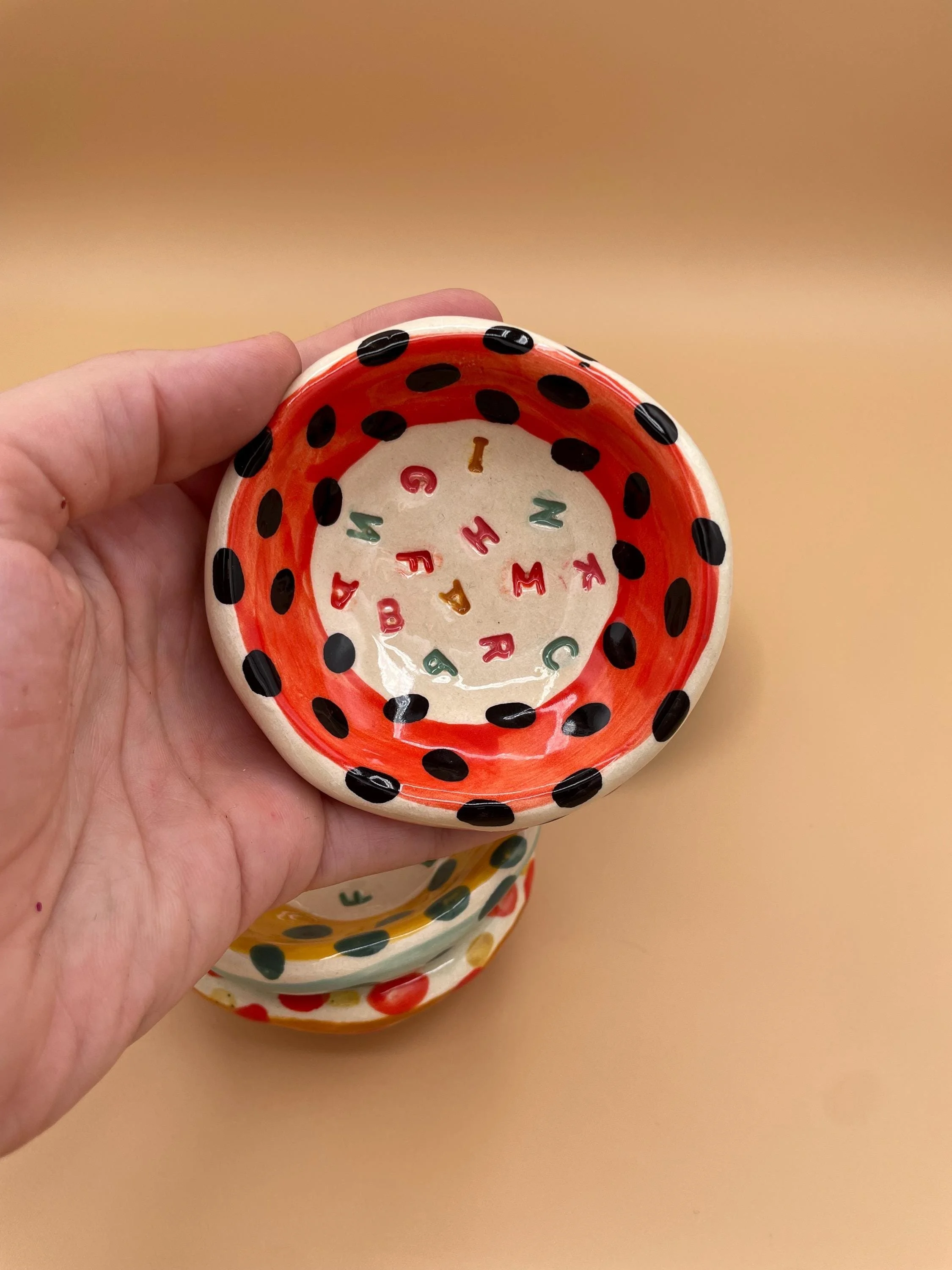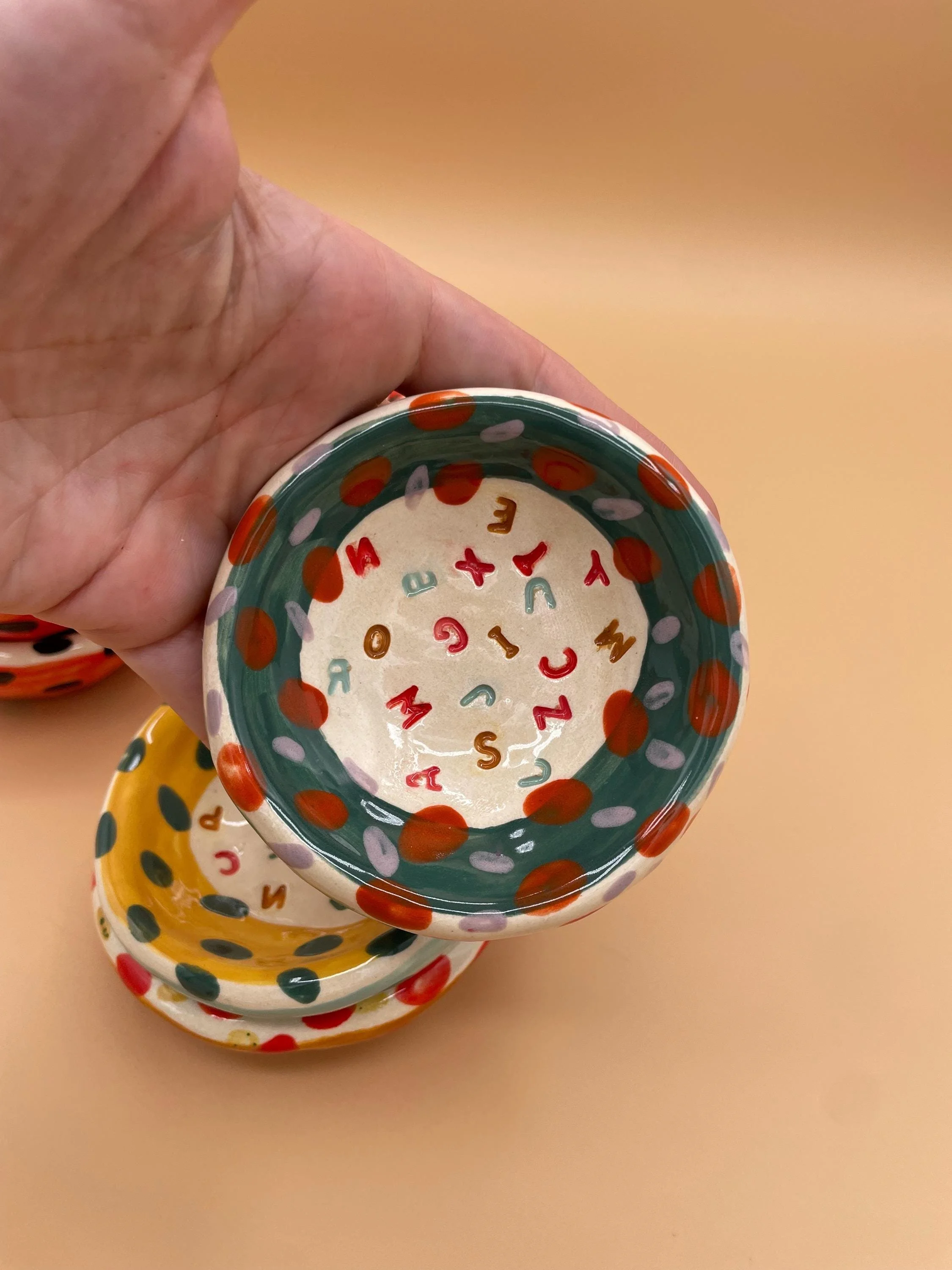 This whimsical group of full patterned, mini alphabet soup bowls features shallow, wide dishes perfect for jewelry, change, trinkets or snacks. Each bowl has a glossy white center with real alphabet soup letters that have been impressed and hand painted in a variety of colors. Each group of random letters is surrounded by bold black polka dots on vibrant rims in teal, yellow, red, pink, and mint. Hand-painted with cheerful confetti accents and glossy food-safe glazes, they're full of folk-art charm and sure to spark smiles anywhere they are displayed.