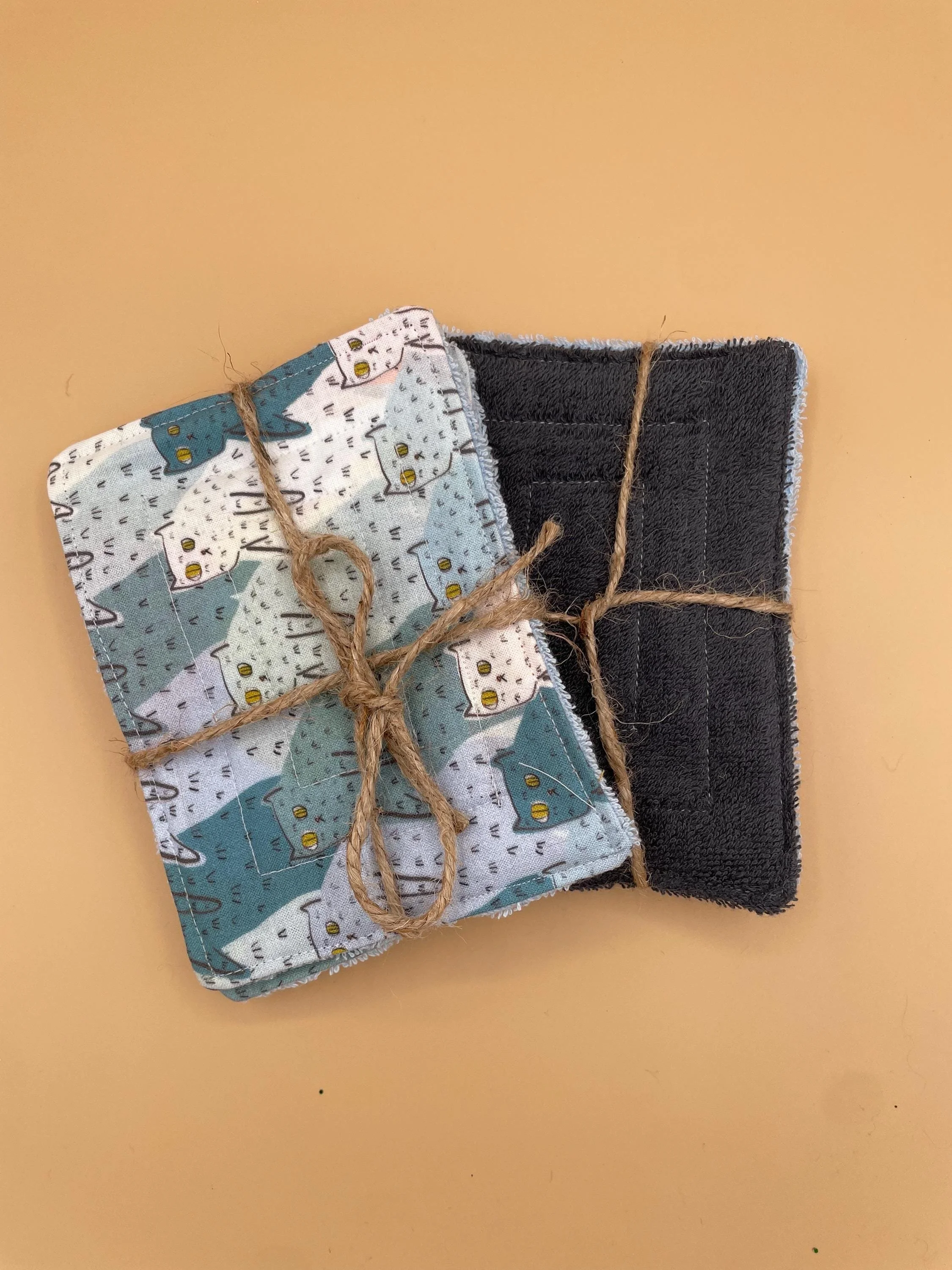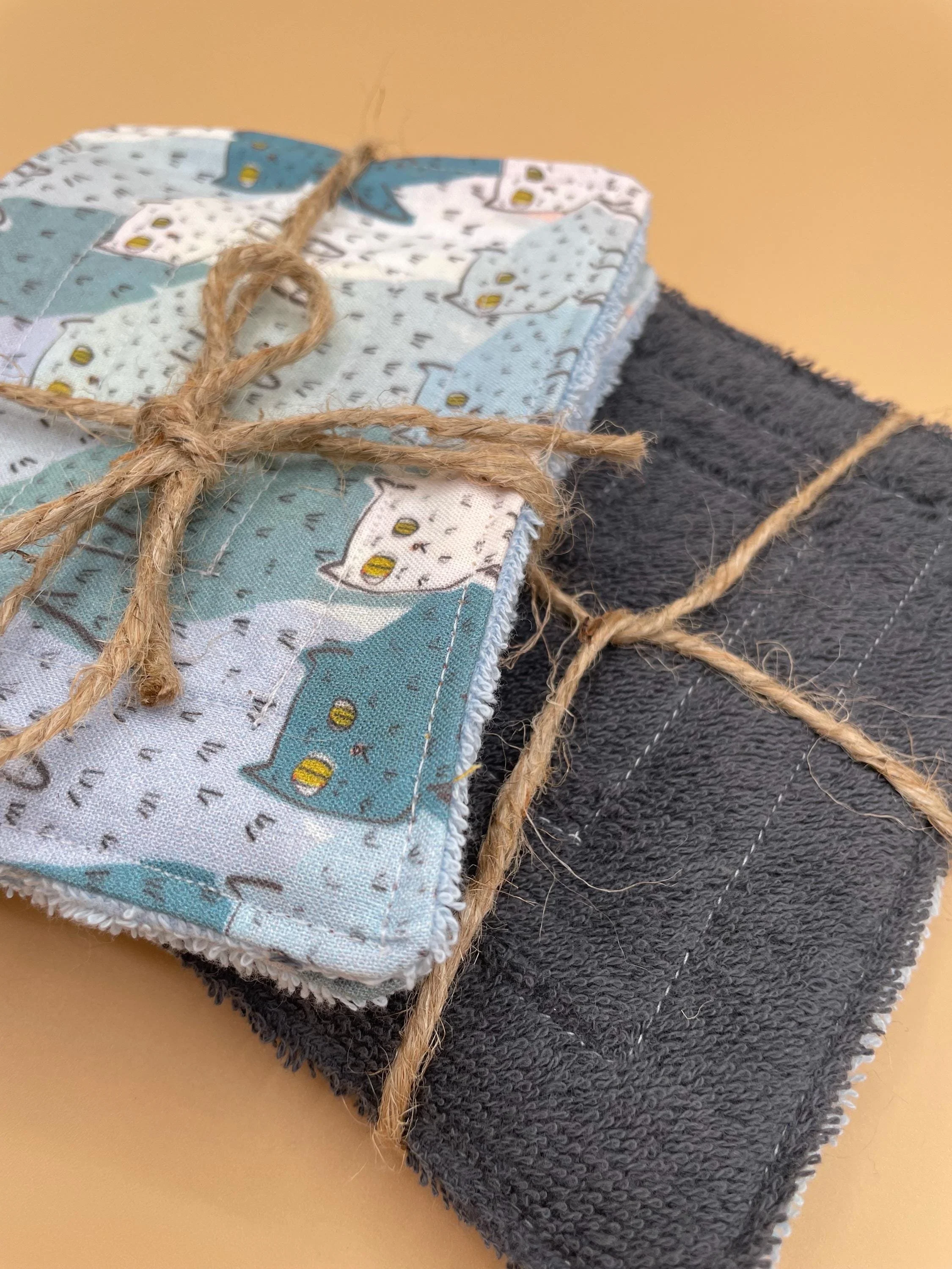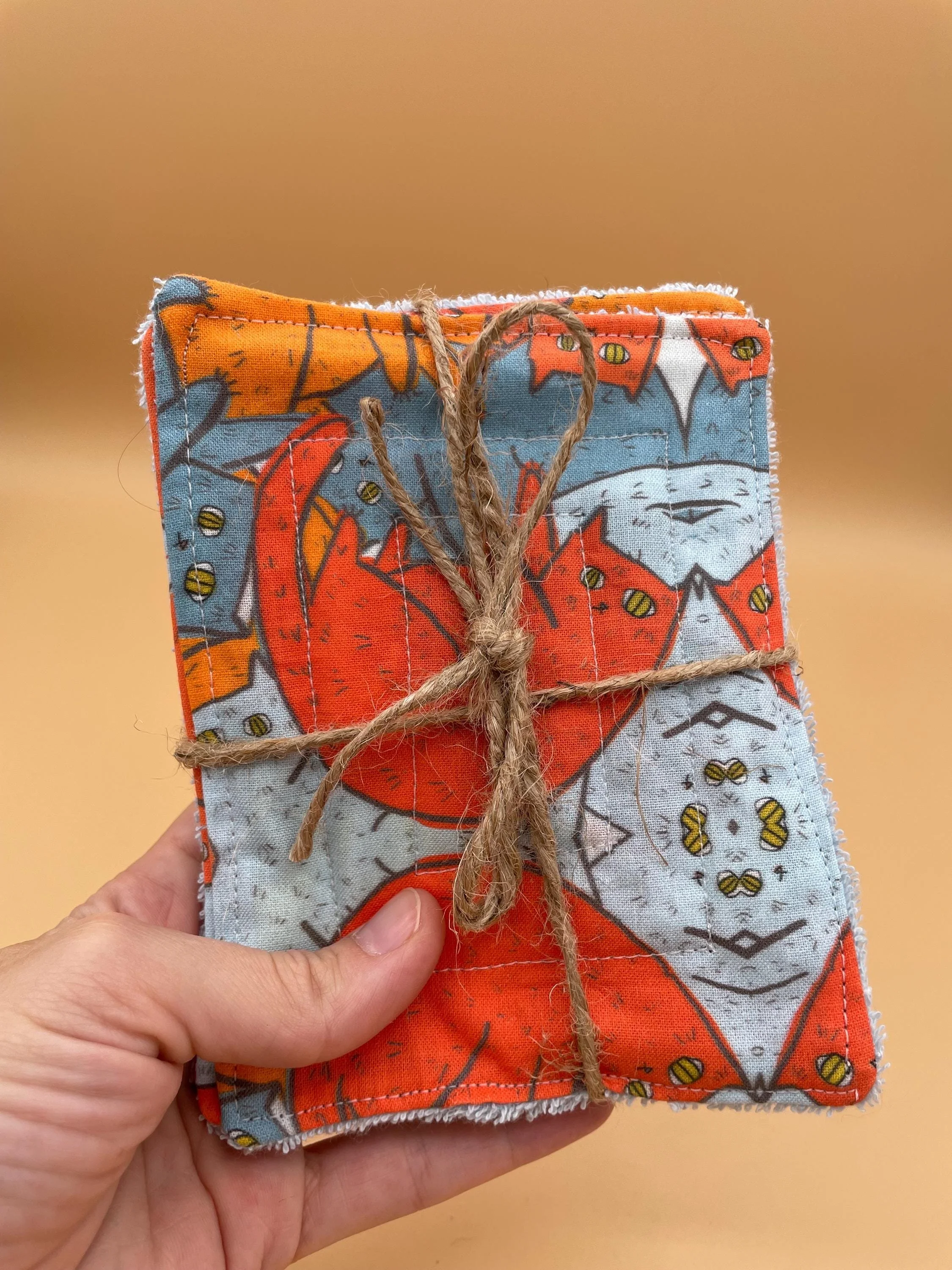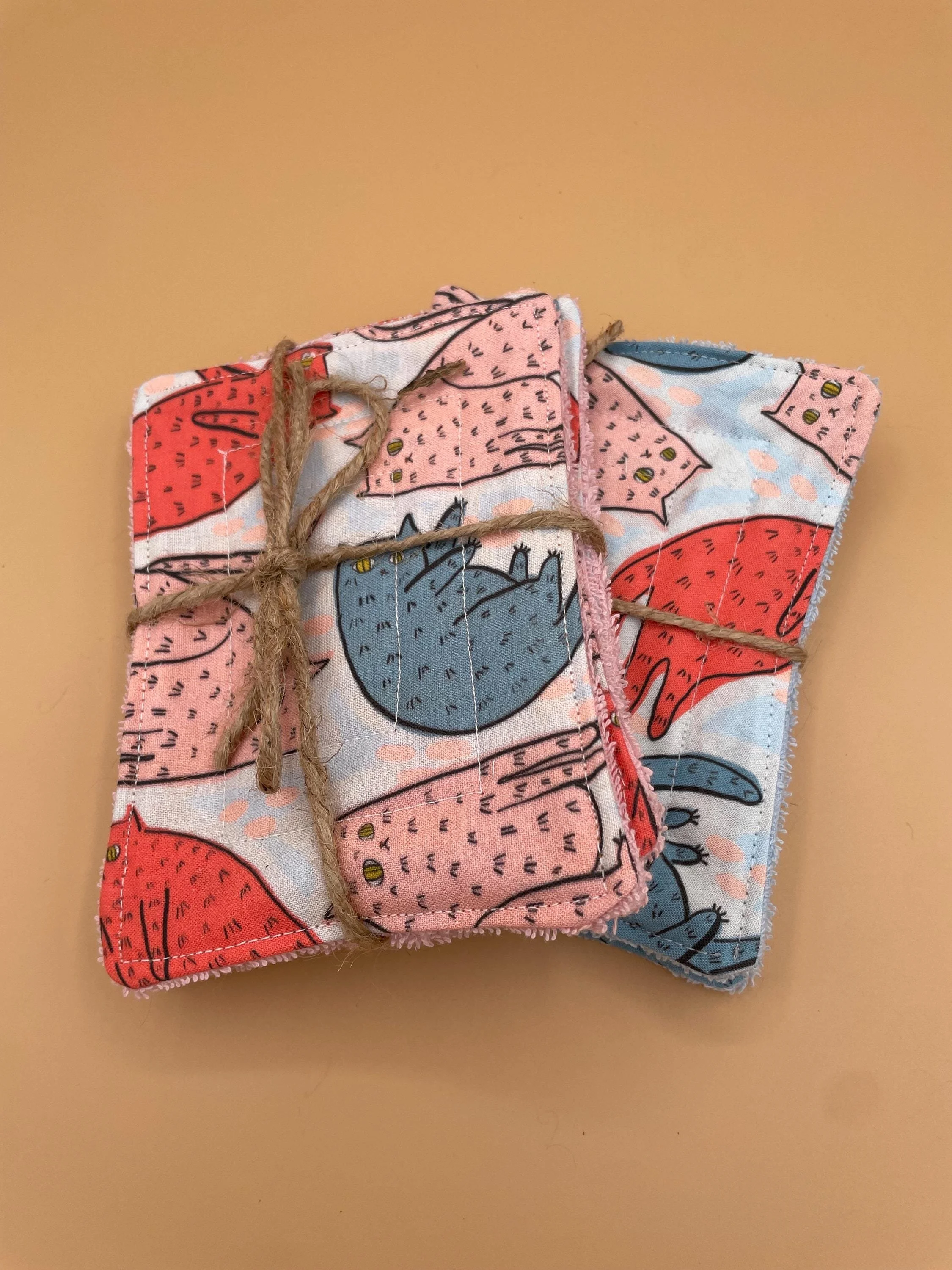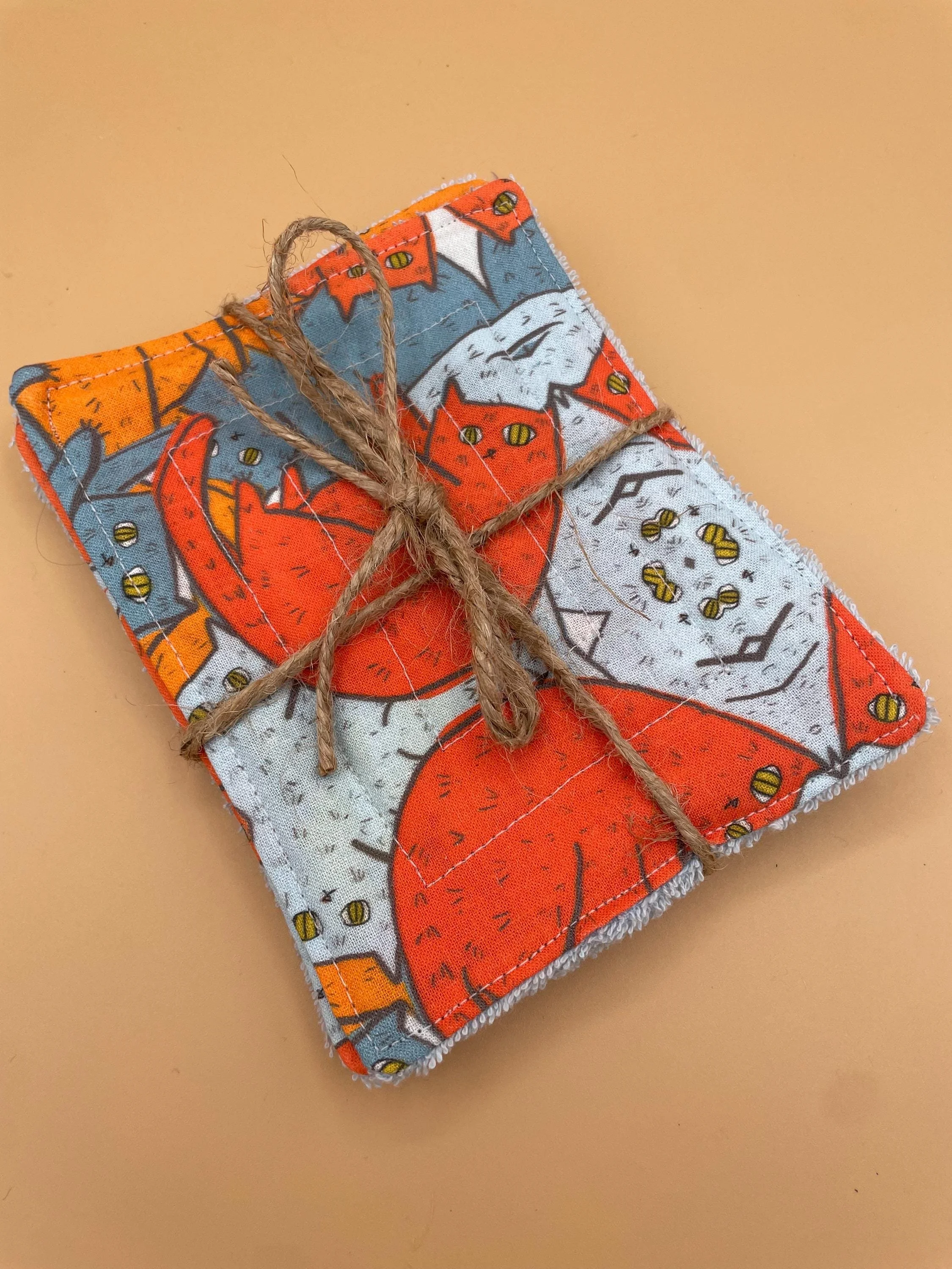 reusable sponge set of 3 washable sponges. Made with 3 layers of cotton and one layer of cotton terry. The cats featured on this fabric are a custom illustration designed and printed by me!