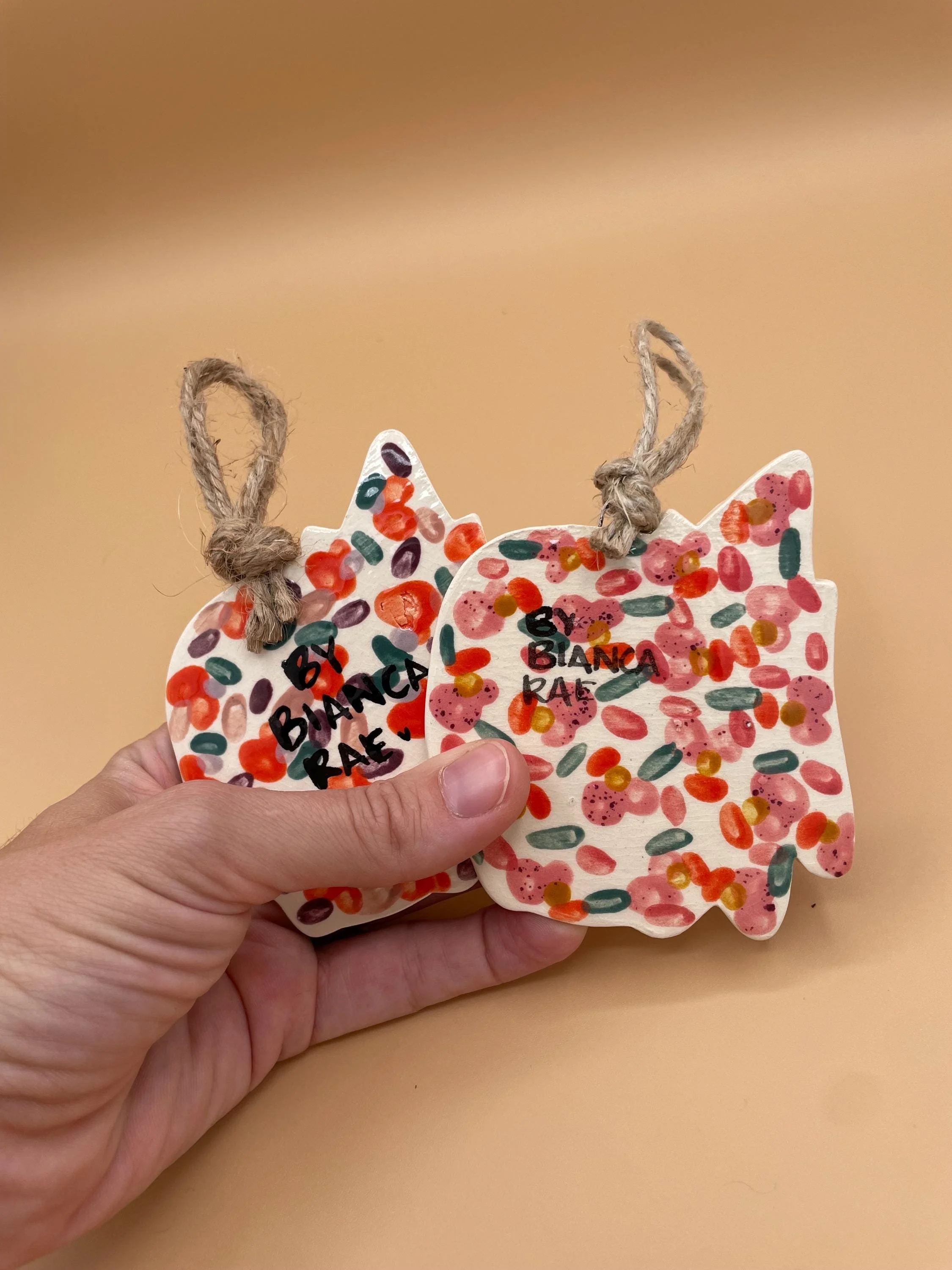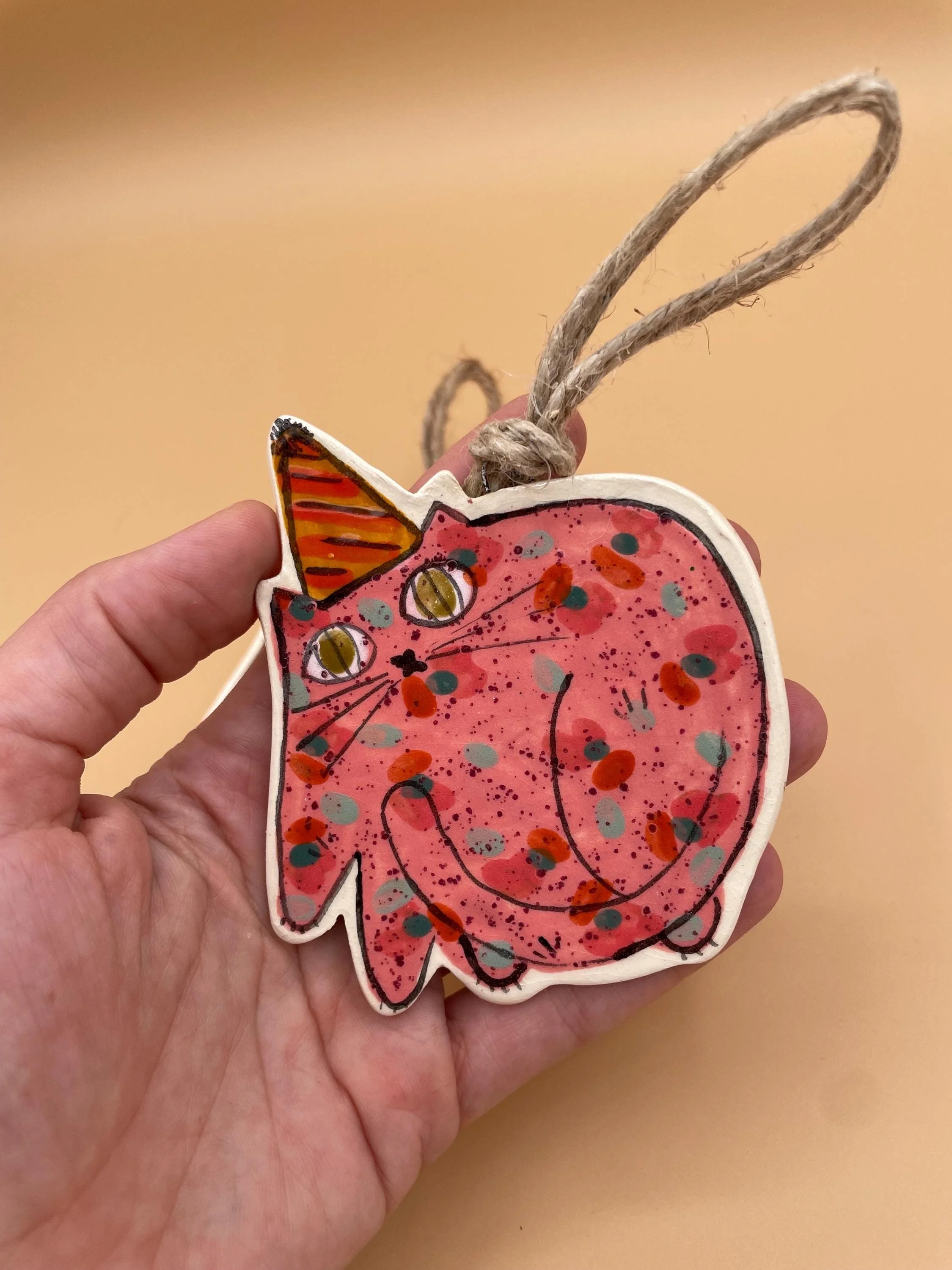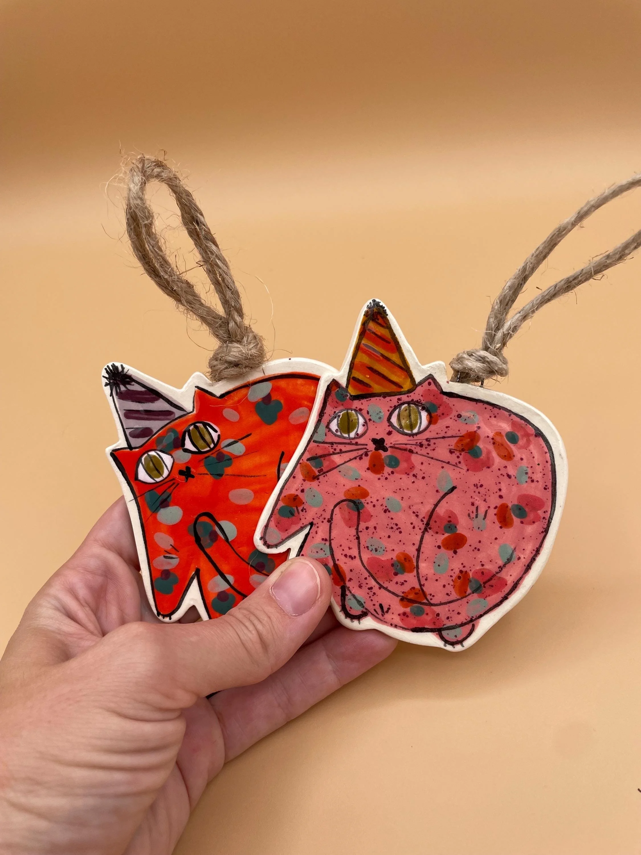 SHOP › PARTY TIME Party Hat Cat Ornament in Sparkle Pink or Red Image 1 of 4 Image 2 of 4 Image 3 of 4 Image 4 of 4 PARTY TIME Party Hat Cat Ornament in Sparkle Pink or Red $30.00 Measuring approximately 3.5 inches in diameter, these hanging party cats are the last of my 2025 batch!Each hangs from natural twine. Great for year round display in any living or work space or put her on your tree! Kitty Selection: Sparkle Pink Red Quantity: Add To Cart Added! Measuring approximately 3.5 inches in diameter, these hanging party cats are the last of my 2025 batch!Each hangs from natural twine. Great for year round display in any living or work space or put her on your tree! Reviews Reviewer Name Review Date Star Rating Description Posted on Etsy Product Show More