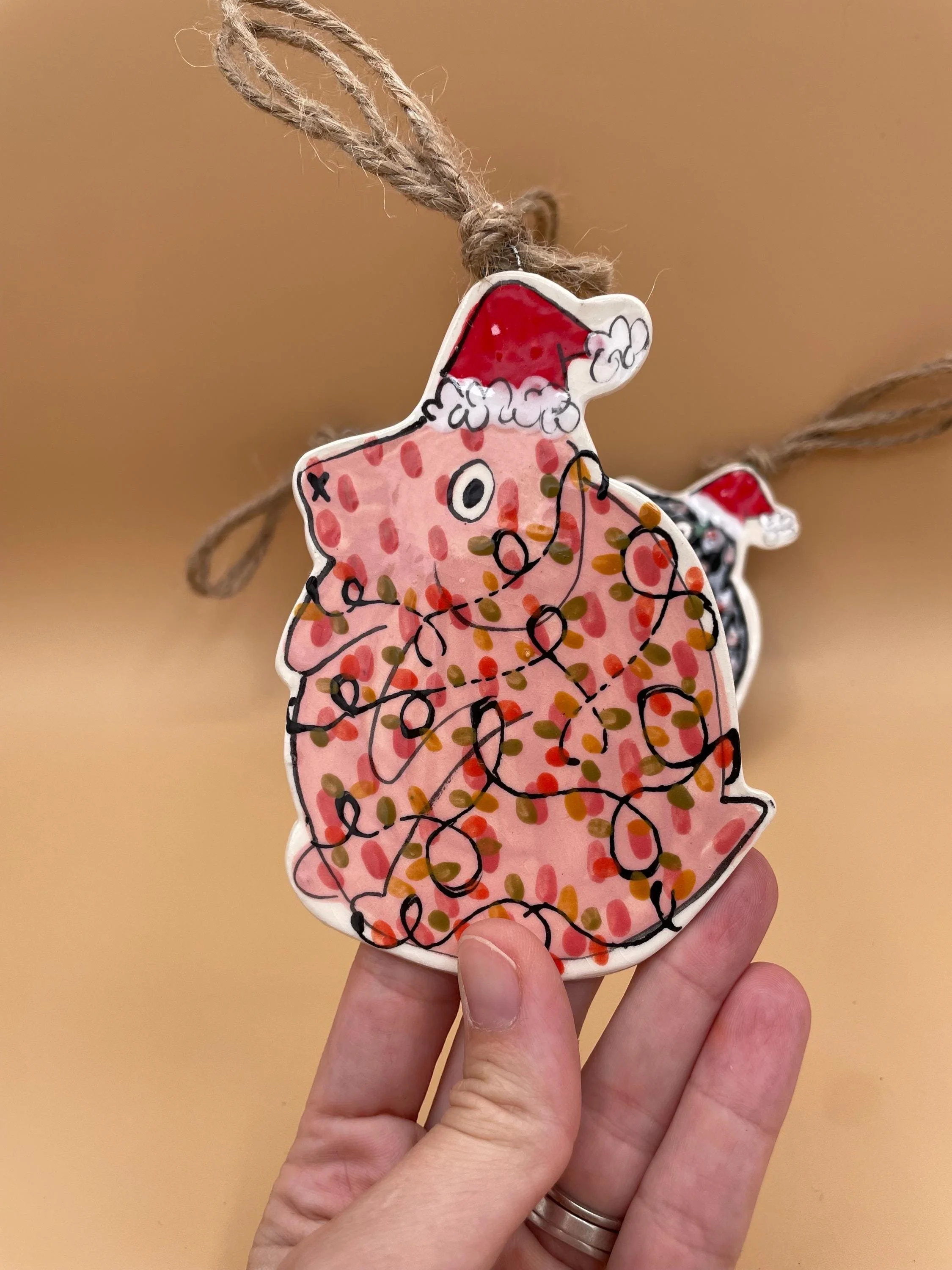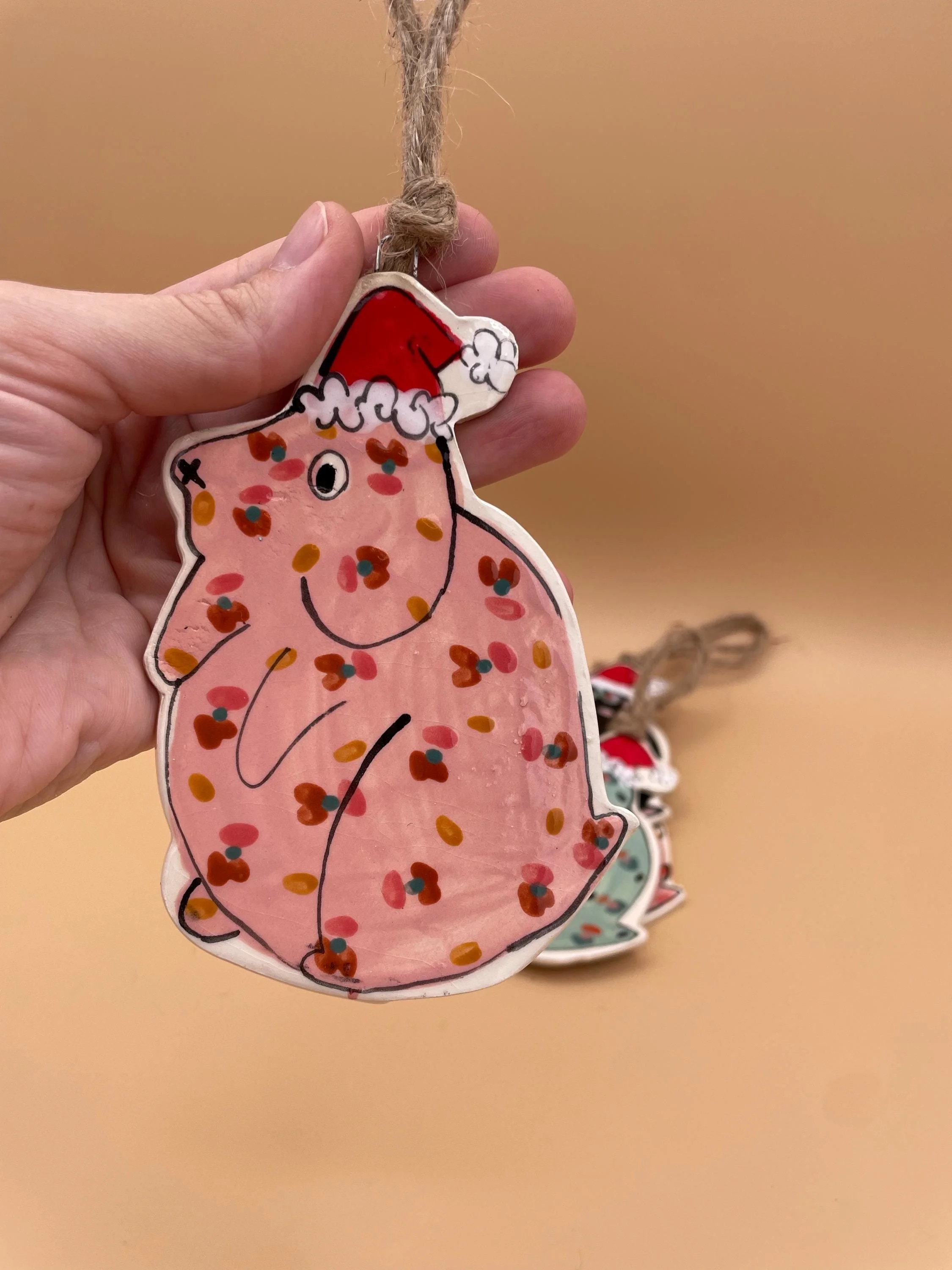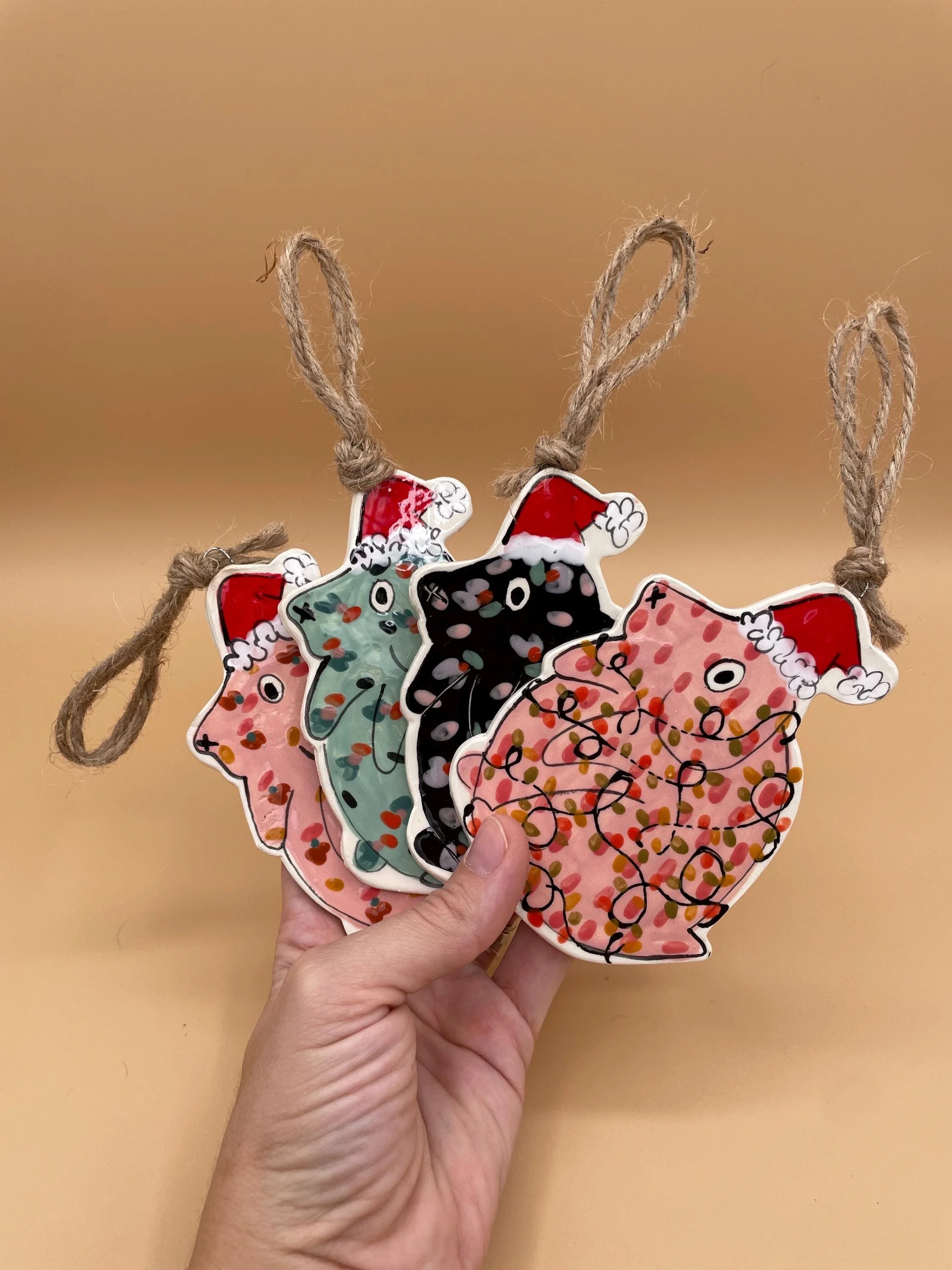 hanging santa dogs measure approximately 4 inches long from hat to bottom. They each hang on natural twine. Available in four color ways - make your selection from the drop down menu at checkout!