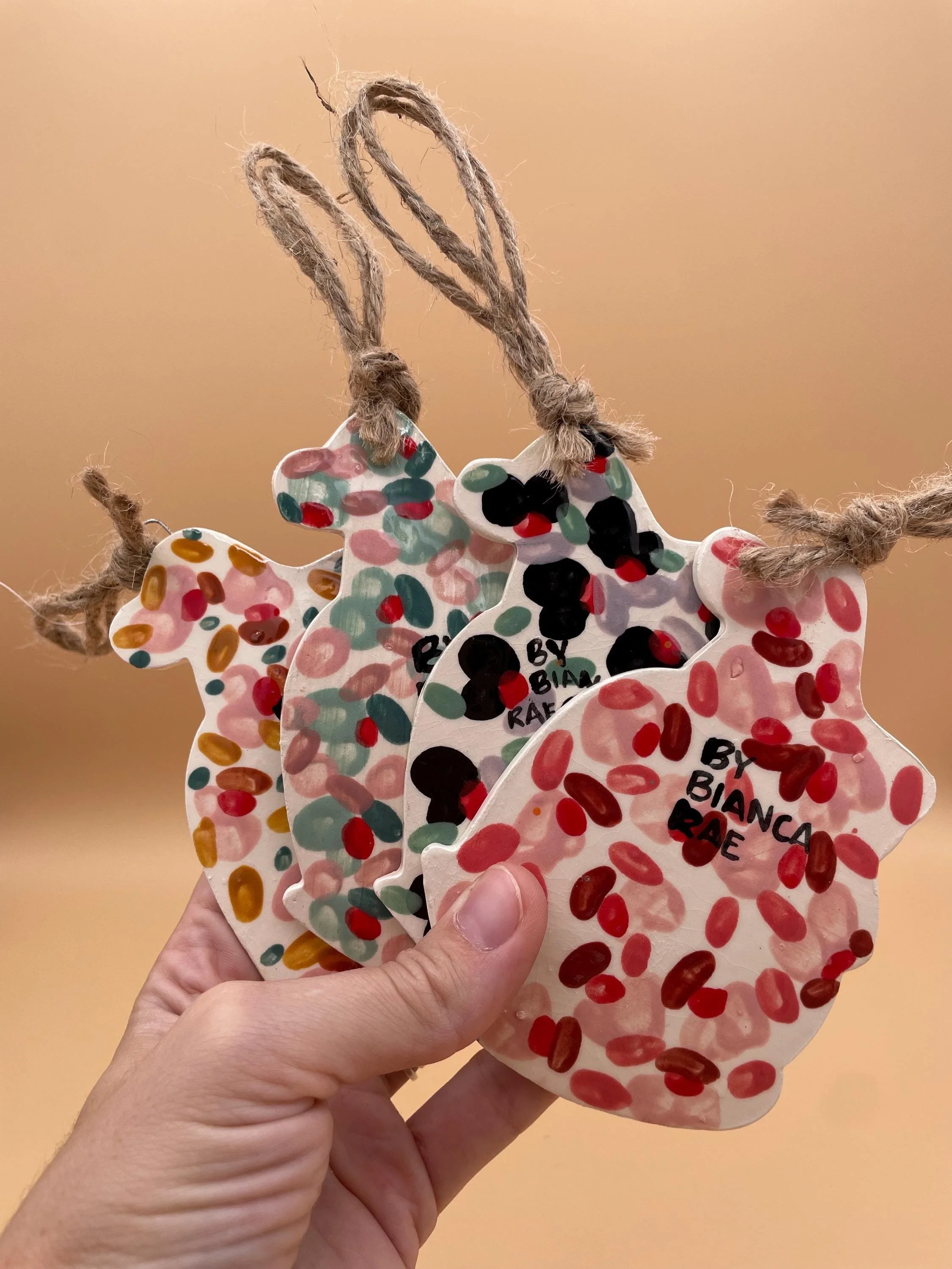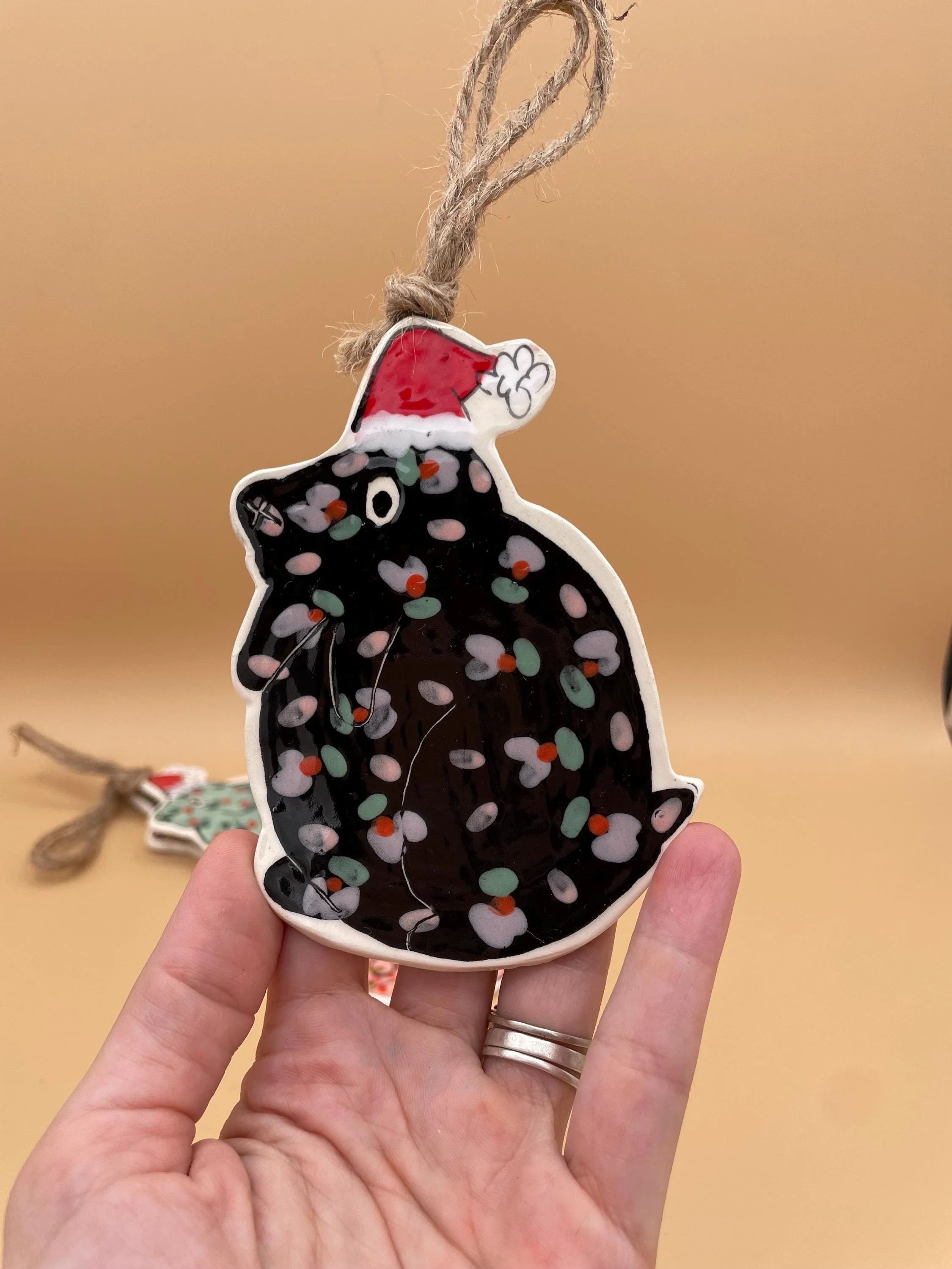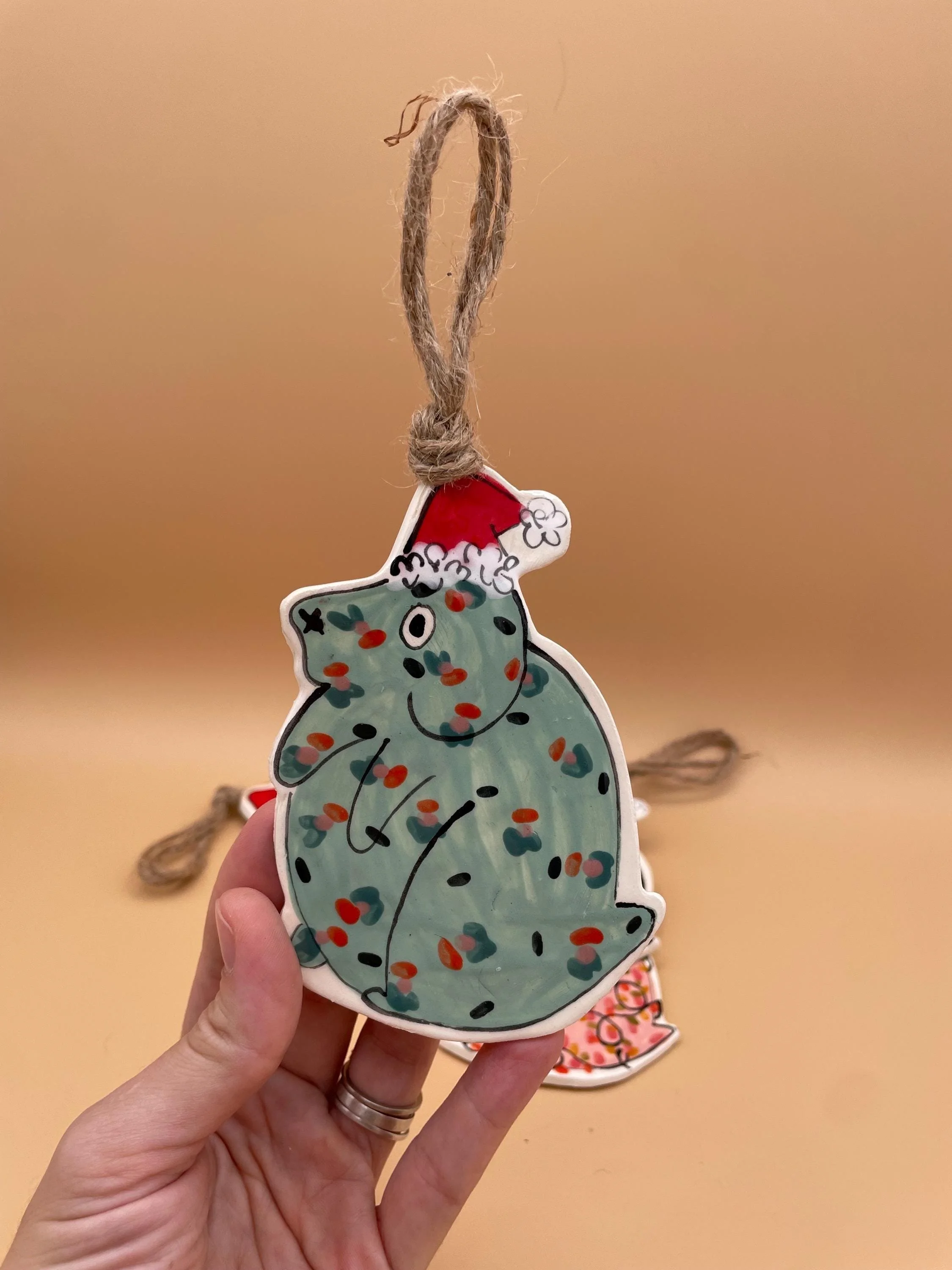 hanging santa dogs measure approximately 4 inches long from hat to bottom. They each hang on natural twine. Available in four color ways - make your selection from the drop down menu at checkout!
