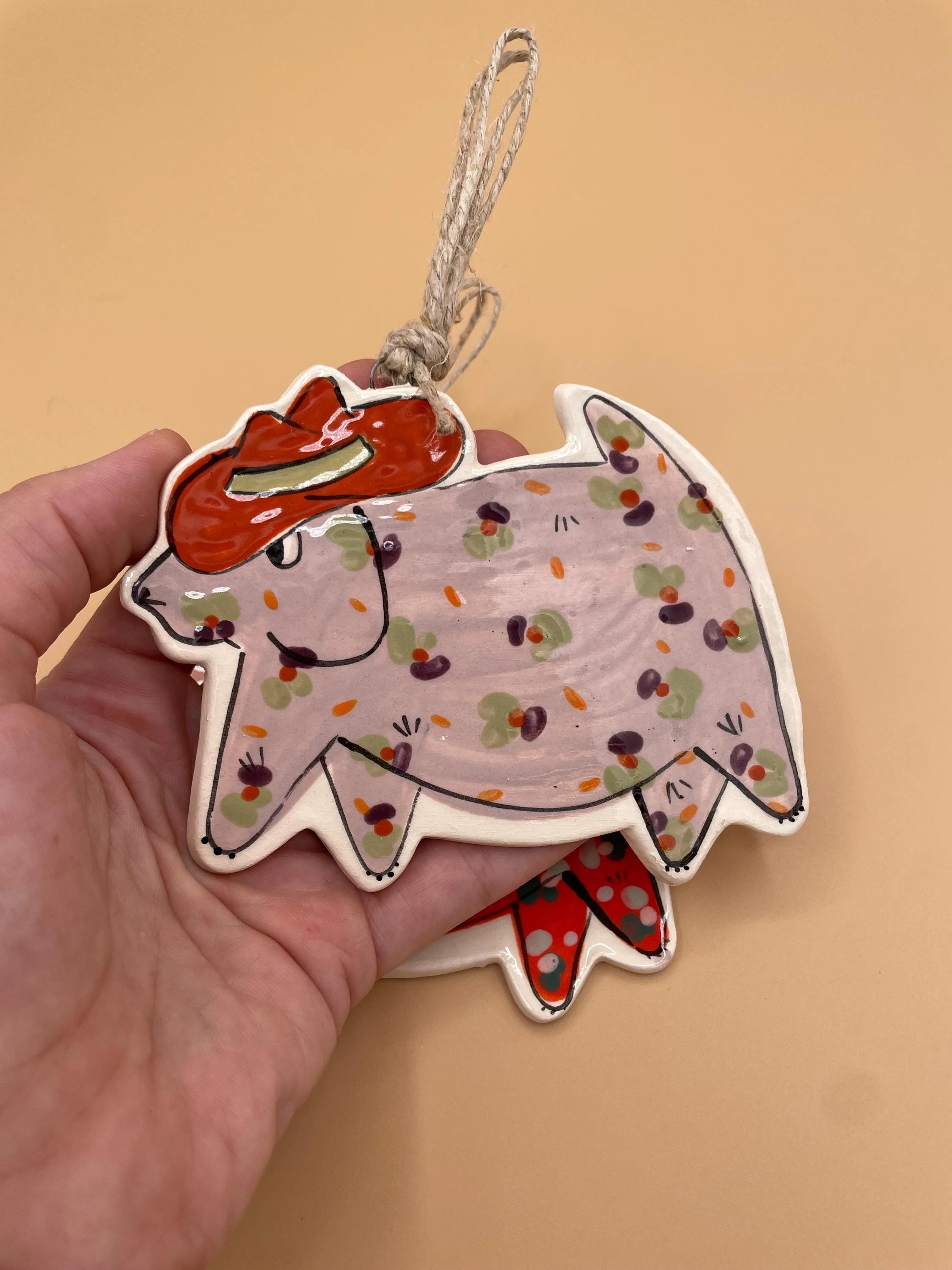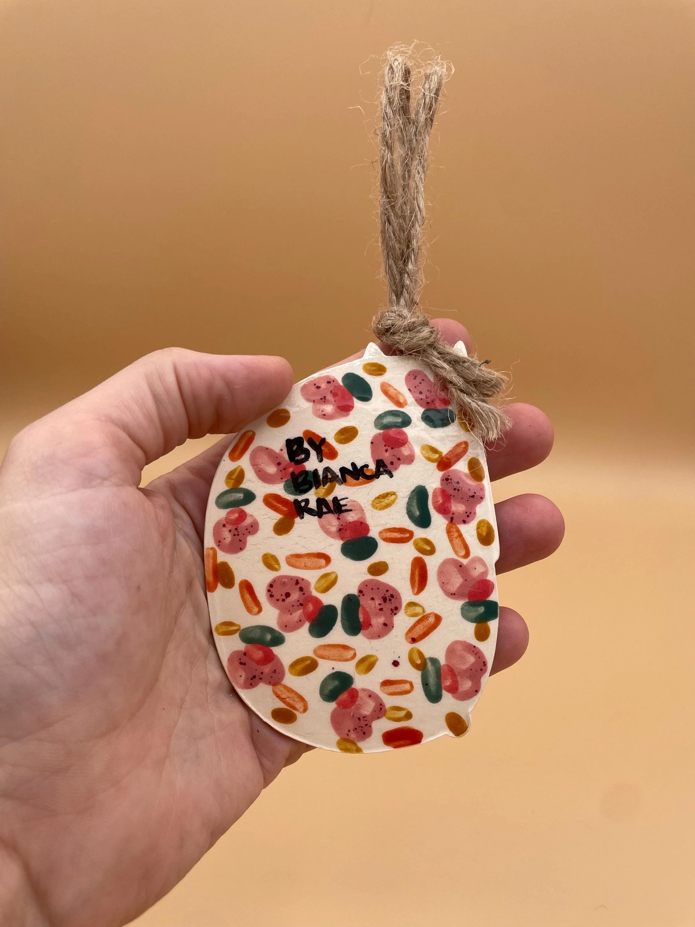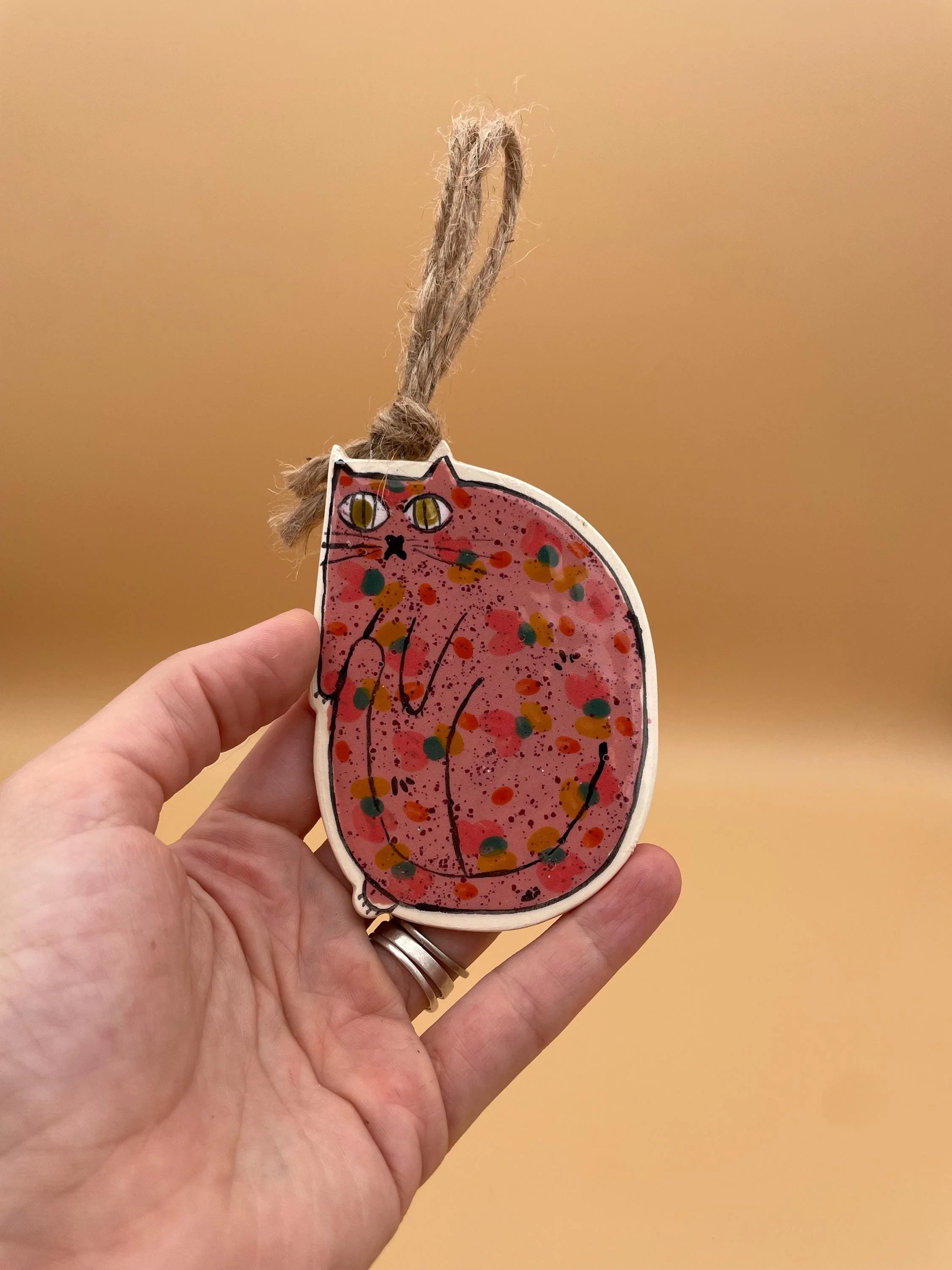 This adorable pink polka dot cat ornament features a chubby, speckled pink kitty with wide eyes, tiny ears, and a curled tail outlined in bold black for that signature folk-art style. Hand-painted on a glossy pink background with colorful confetti spots in teal, orange, yellow, and red, it's full of personality and ready to hang with a natural twine loop. Lightweight and delightfully quirky, this little cat is sure to bring smiles all season long.